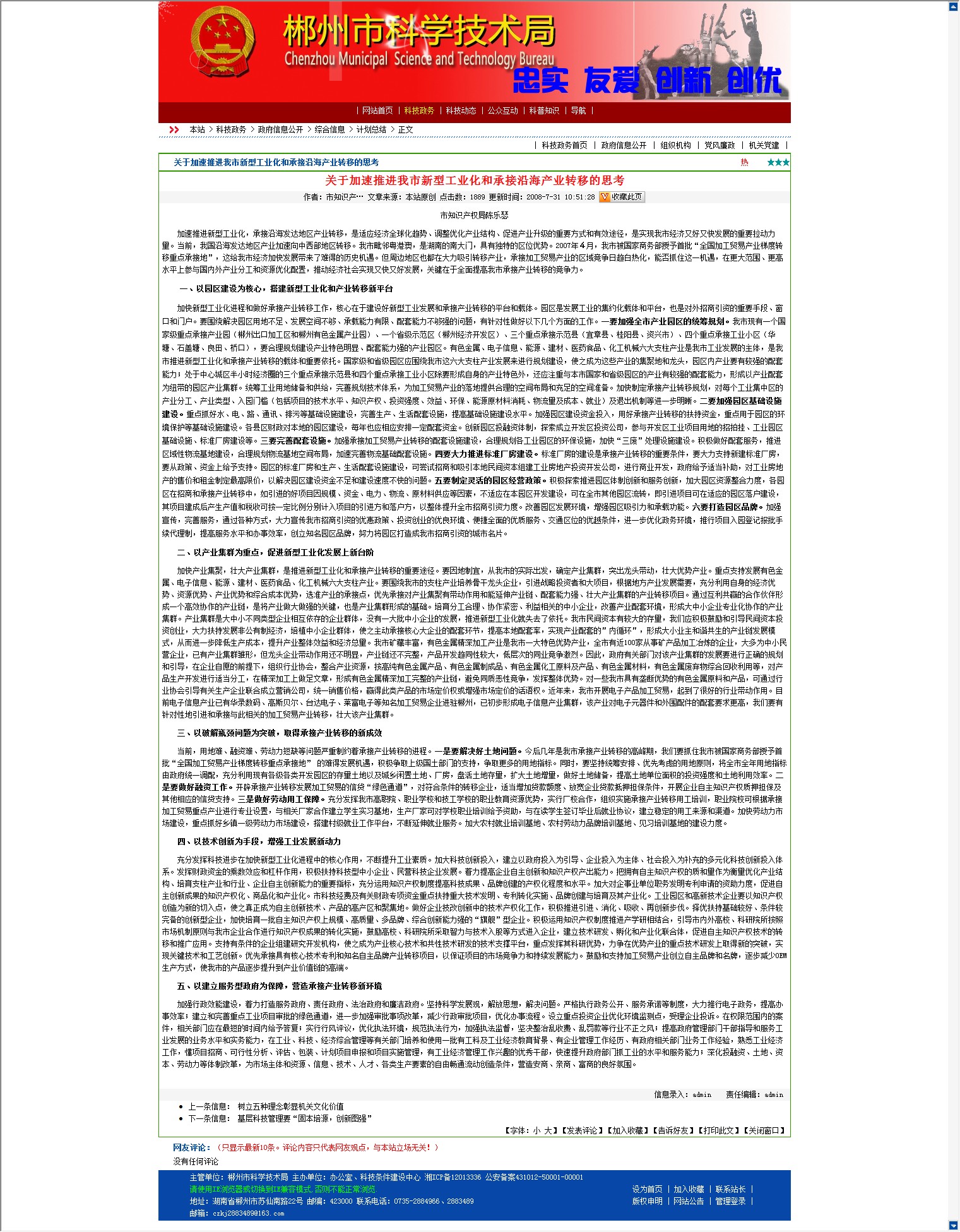 充分发挥科技进步在加快新型工业化进程中的核心作用,不断提升工业素质。加大科技创新投入,建立以政府投入为引导、企业投入为主体、社会投入为补充的多元化科技创新投入体系。发挥财政资金的乘数效应和杠杆作用,积极扶持科技型中小企业、民营科技企业发展。着力提高企业自主创新和知识产权产出能力。把拥有自主知识产权的质和量作为衡量优化产业结构、培育支柱产业和行业、企业自主创新能力的重要指标,充分运用知识产权制度提高科技成果、品牌创建的产权化程度和水平。加大对企事业单位职务发明专利申请的资助力度,促进自主创新成果的知识产权化、商品化和产业化。市科技经费及有关财政专项资金重点扶持重大技术发明、专利转化实施、品牌创建与培育及其产业化。工业园区和高新技术企业要以知识产权创造为新的切入点,使之真正成为自主创新技术、产品的高产区和聚集地。做好企业技改创新中的技术产权化工作,积极推进引进、消化、吸收、再创新步伐。择优扶持基础较好、条件较完备的创新型企业,加快培育一批自主知识产权上规模、高质量、多品牌、综合创新能力强的“旗舰”型企业。积极运用知识产权制度推进产学研相结合,引导市内外高校、科研院所按照市场机制原则与我市企业合作进行知识产权成果的转化实施,鼓励高校、科研院所采取智力与技术入股等方式进入企业,建立技术研发、孵化和产业化联合体,促进自主知识产权技术的转移和推广应用。支持有条件的企业组建研究开发机构,使之成为产业核心技术和共性技术研发的技术支撑平台,重点发挥其科研优势,力争在优势产业的重点技术研发上取得新的突破,实现关键技术和工艺创新。优先承接具有核心技术专利和知名自主品牌产业转移项目,以保证项目的市场竞争力和持续发展能力。鼓励和支持加工贸易产业创立自主品牌和名牌,逐步减少OEM生产方式,使我市的产品逐步提升到产业价值链的高端。
