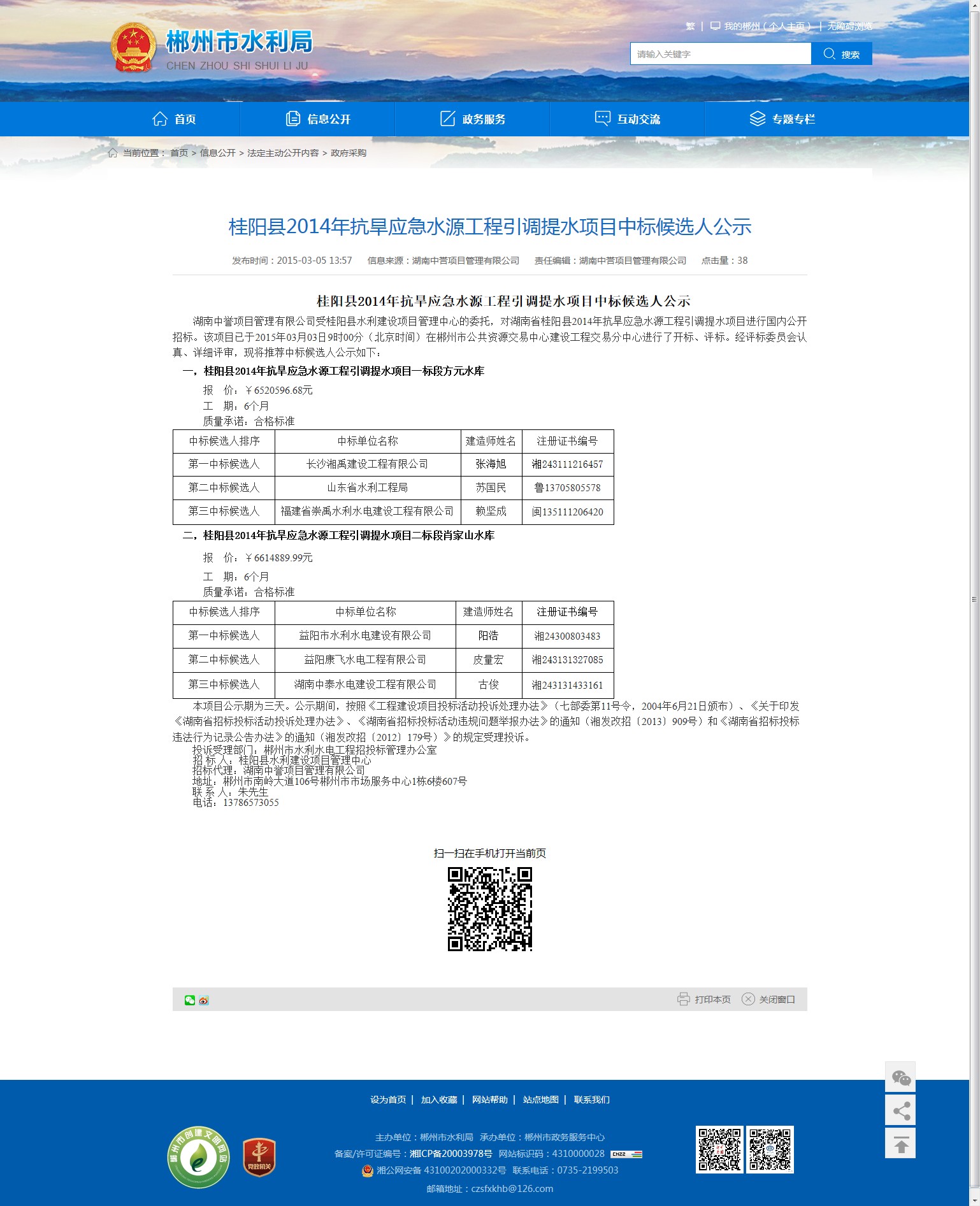 桂阳县2014年抗旱应急水源工程引调提水项目中标候选人公示