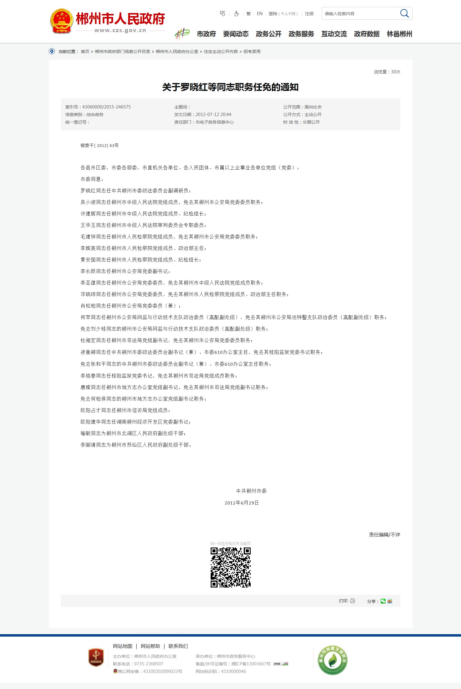 罗晓红同志任中共郴州市委政法委员会副调研员;