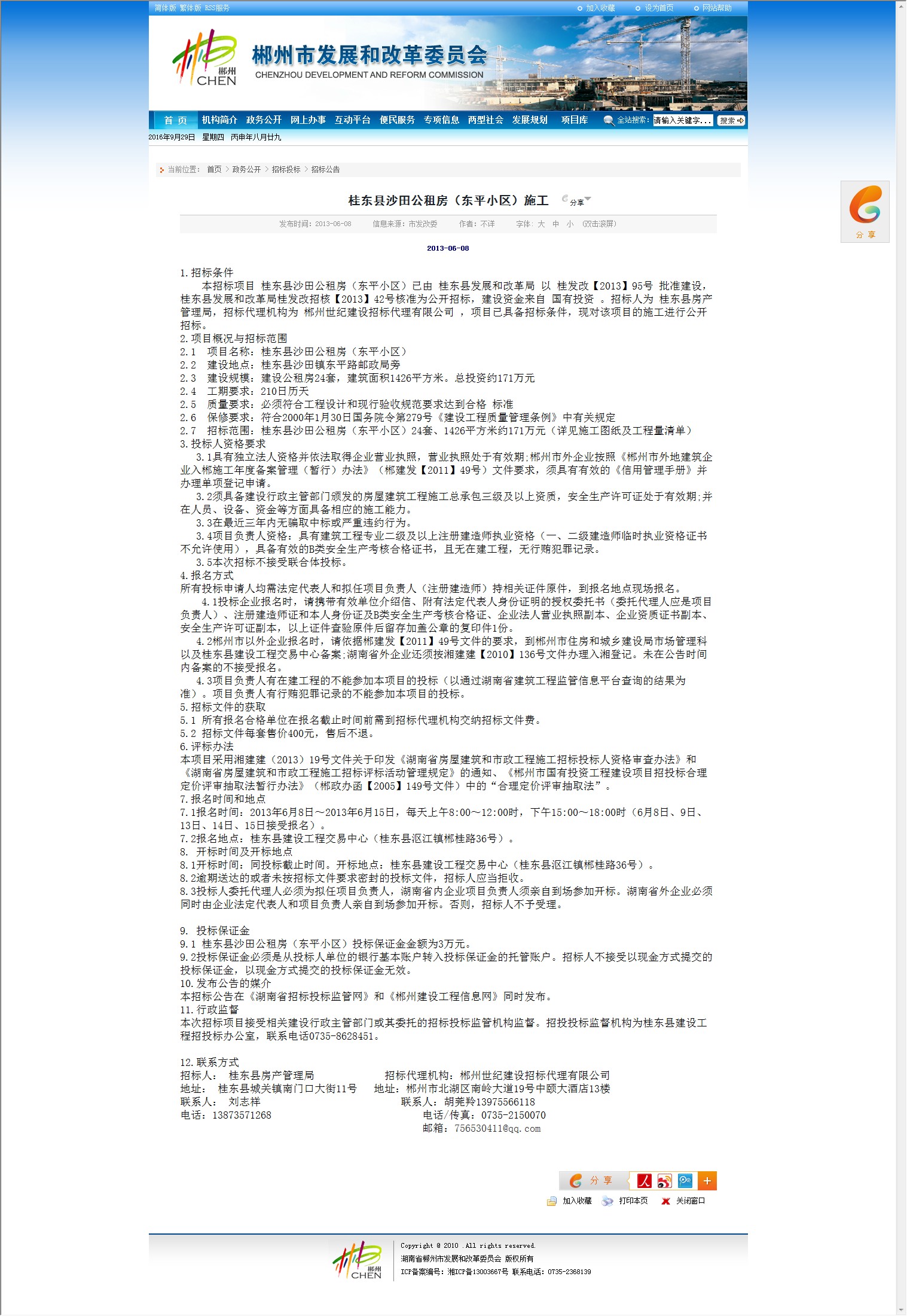 本招标项目 桂东县沙田公租房(东平小区)已由 桂东县发展和改革局 以 桂发改【2013】95号 批准建设,桂东县发展和改革局桂发改招核【2013】42号核准为公开招标,建设资金来自 国有投资 。招标人为 桂东县房产管理局,招标代理机构为 郴州世纪建设招标代理有限公司 ,项目已具备招标条件,现对该项目的施工进行公开招标。