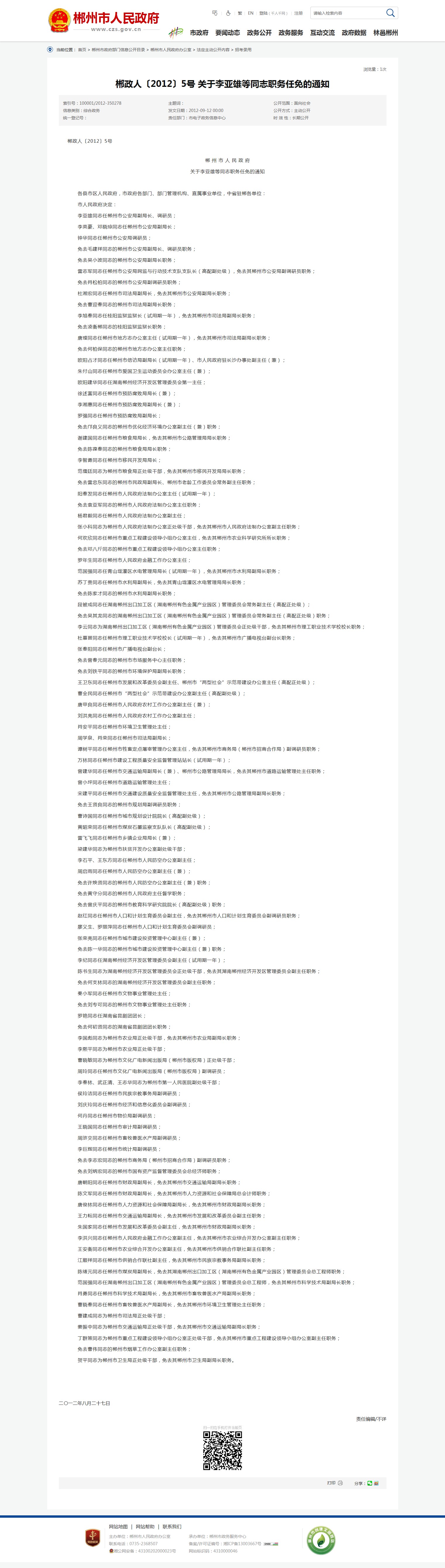 王力耘同志任郴州市交通运输局副局长,免去其郴州市发展和改革委员会副主任职务;