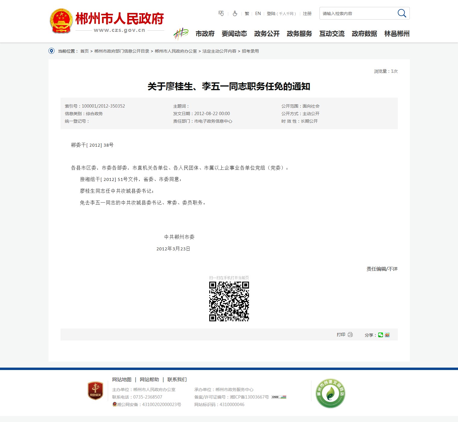 接湘组干[ 2012] 51号文件,省委、市委同意: