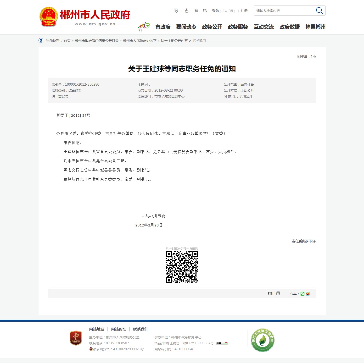 发文字号:郴委干[2012]37号