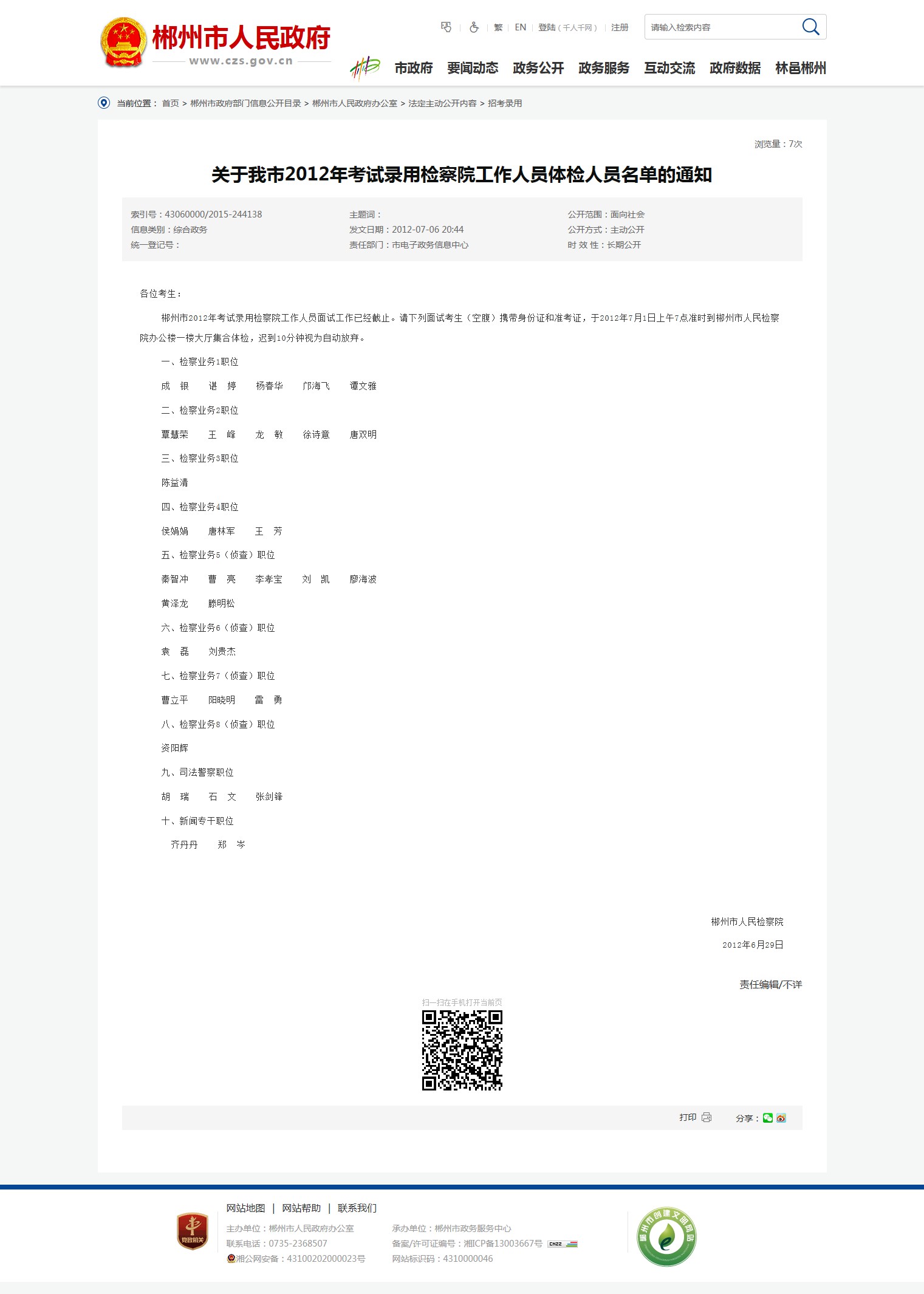 郴州市2012年考试录用检察院工作人员面试工作已经截止。请下列面试考生(空腹)携带身份证和准考证,于2012年7月1日上午7点准时到郴州市人民检察院办公楼一楼大厅集合体检,迟到10分钟视为自动放弃。