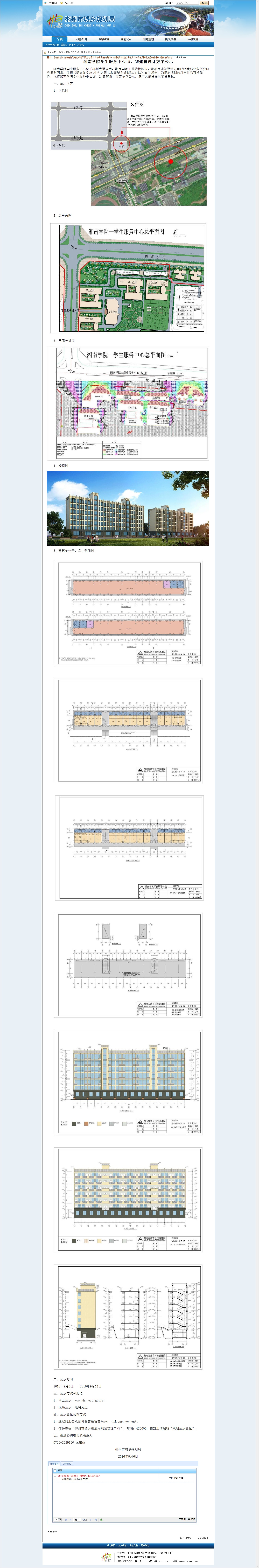 湘南学院学生服务中心位于郴州大道以南,湘南学院王仙岭校区内。该项目建筑设计方案已经我局业务例会研究原则同意。依据《湖南省实施<中华人民共和国城乡规划法>办法》有关规定,为提高规划的科学性和可操作性,现将湘南学院学生服务中心1#、2#建筑设计方案予以公示,请广大市民提出宝贵意见。