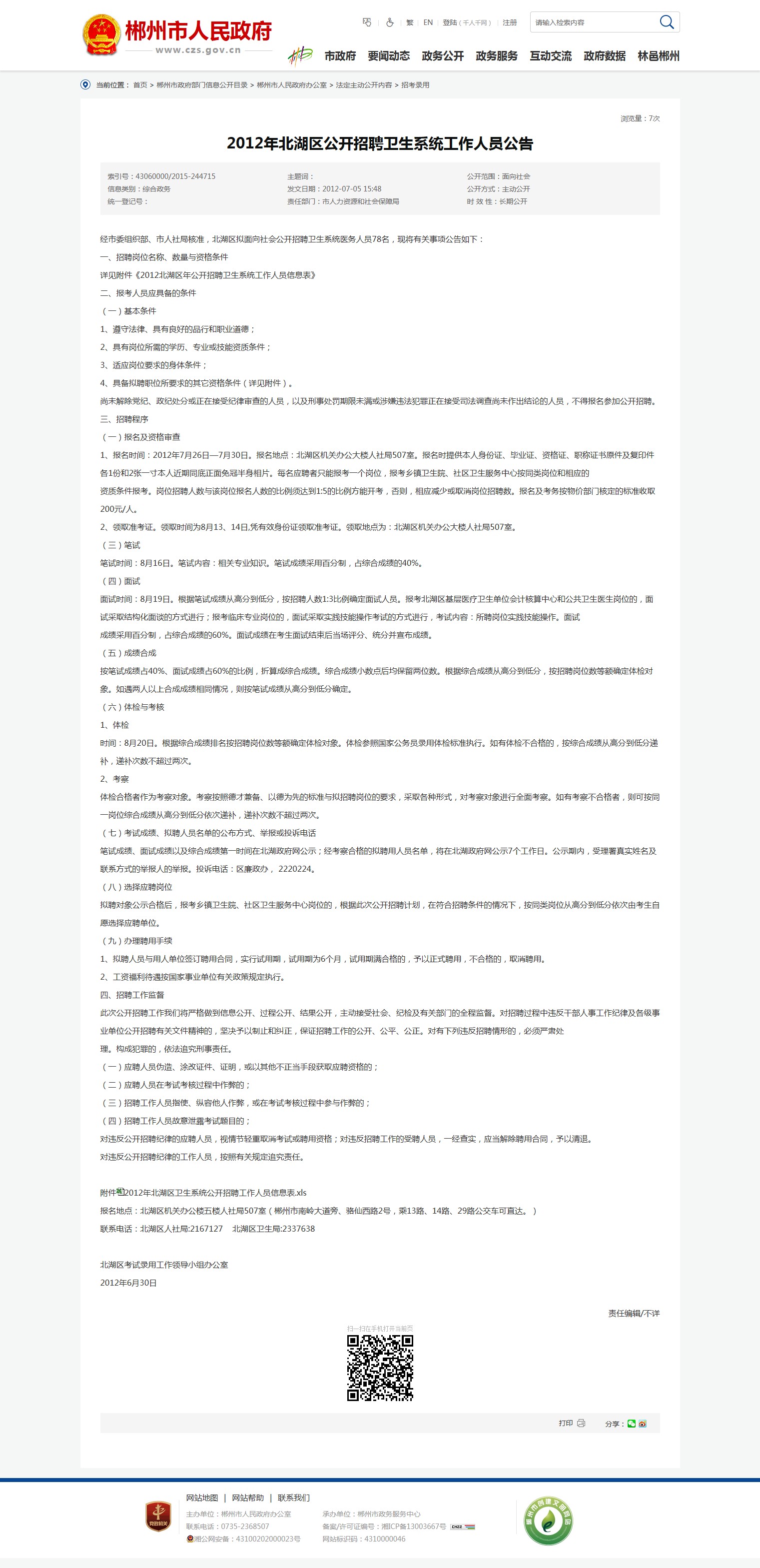 笔试成绩、面试成绩以及综合成绩第一时间在北湖政府网公示;经考察合格的拟聘用人员名单,将在北湖政府网公示7个工作日。公示期内,受理署真实姓名及联系方式的举报人的举报。投诉电话:区廉政办, 2220224。