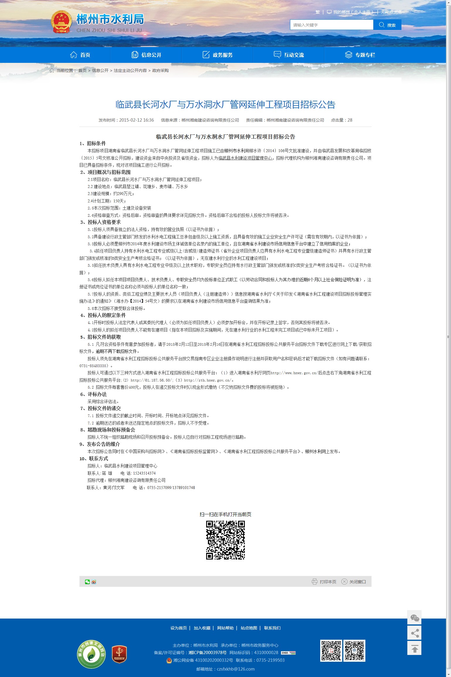 本次招标公告同时在《中国采购与招标网》、《湖南省招标投标监管网》、《湖南省水利工程招标投标公共服务平台》、郴州水利网上发布。