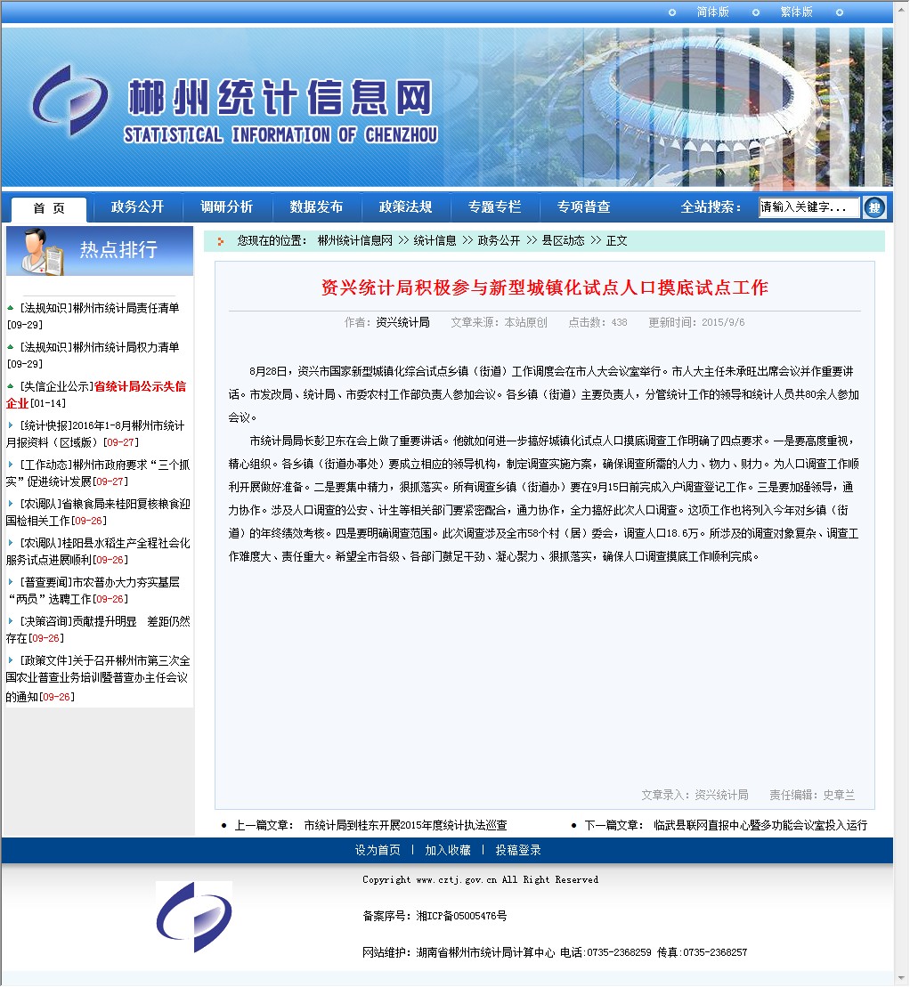 市统计局局长彭卫东在会上做了重要讲话。他就如何进一步搞好城镇化试点人口摸底调查工作明确了四点要求。一是要高度重视,精心组织。各乡镇(街道办事处)要成立相应的领导机构,制定调查实施方案,确保调查所需的人力、物力、财力。为人口调查工作顺利开展做好准备。二是要集中精力,狠抓落实。所有调查乡镇(街道办)要在9月15日前完成入户调查登记工作。三是要加强领导,通力协作。涉及人口调查的公安、计生等相关部门要紧密配合,通力协作,全力搞好此次人口调查。这项工作也将列入今年对乡镇(街道)的年终绩效考核。四是要明确调查范围。此次调查涉及全市58个村(居)委会,调查人口18.6万。所涉及的调查对象复杂、调查工作难度大、责任重大。希望全市各级、各部门鼓足干劲、凝心聚力、狠抓落实,确保人口调查摸底工作顺利完成。