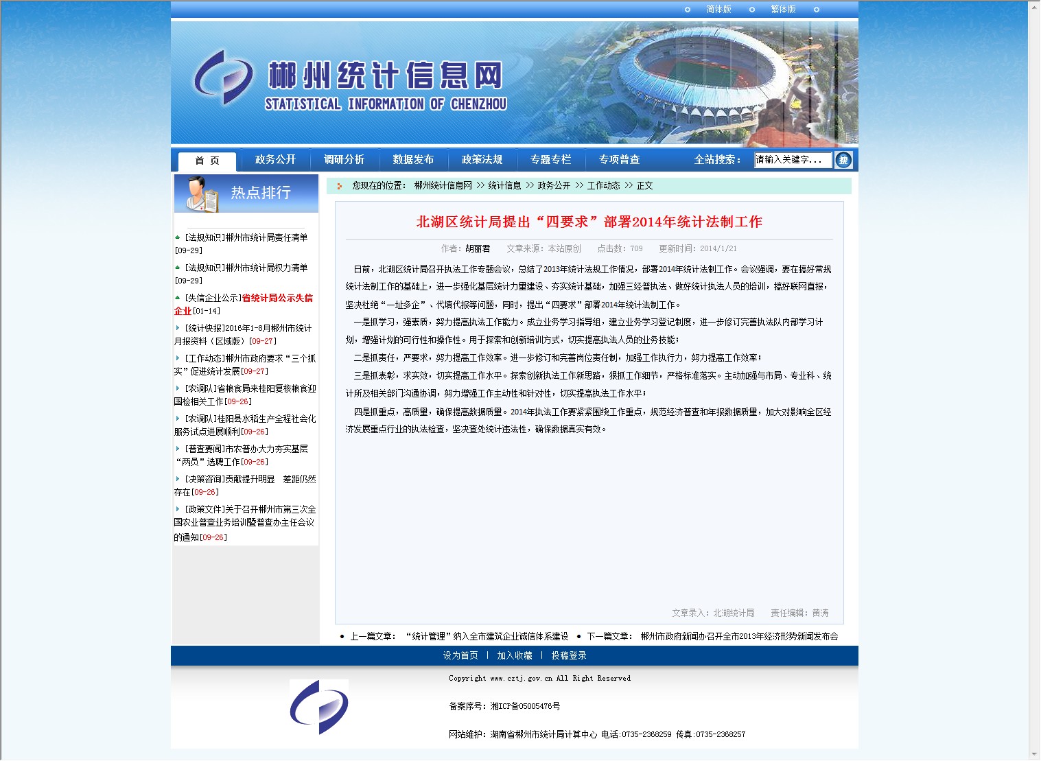 四是抓重点,高质量,确保提高数据质量。2014年执法工作要紧紧围绕工作重点,规范经济普查和年报数据质量,加大对影响全区经济发展重点行业的执法检查,坚决查处统计违法性,确保数据真实有效。