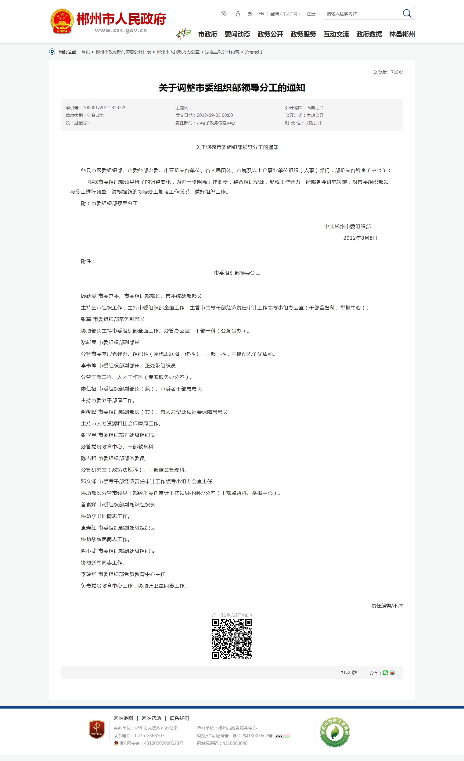 主持全市组织工作,主持市委组织部全面工作,主管市领导干部经济责任审计工作领导小组办公室(干部监督科、举报中心)。