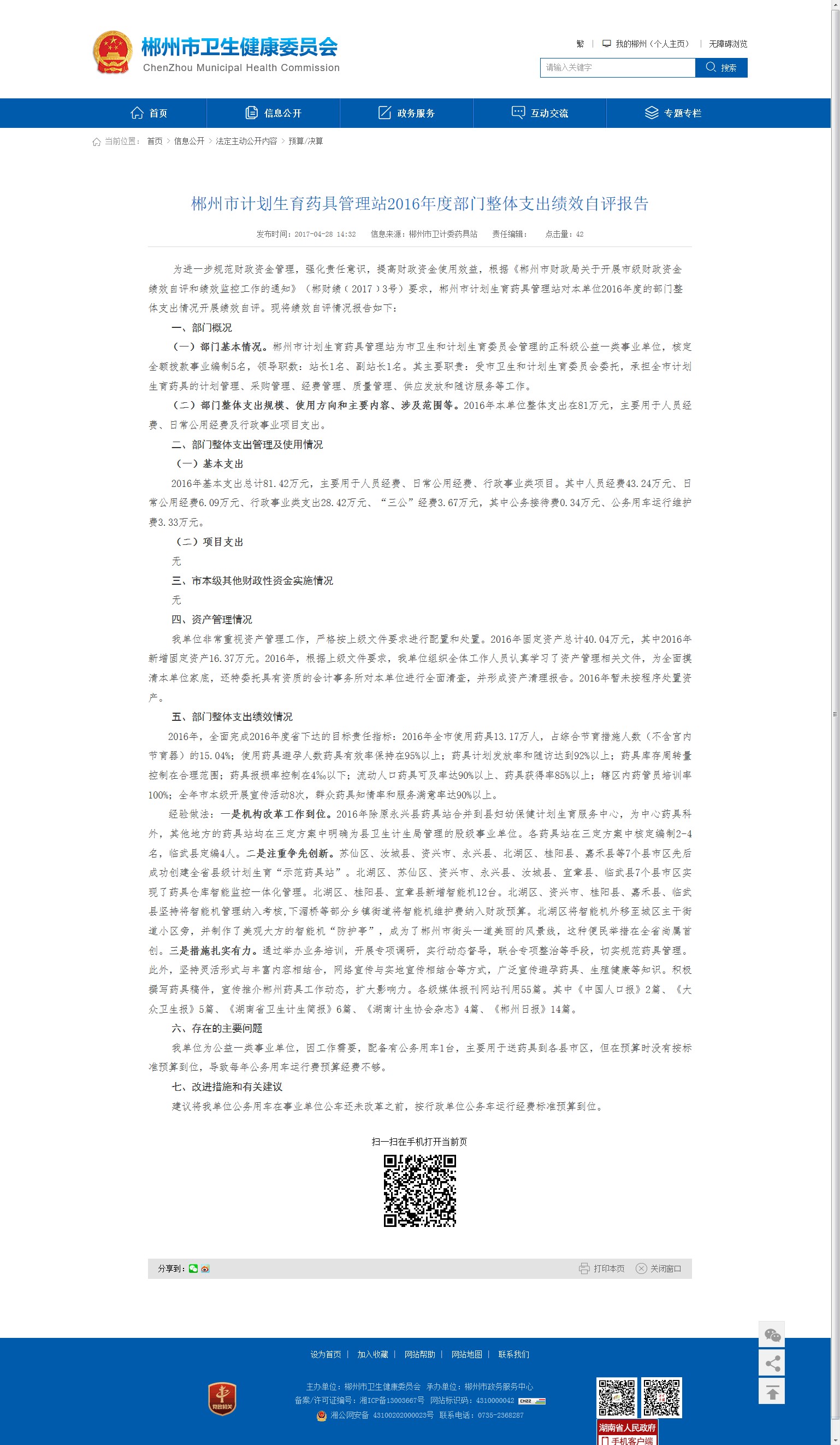 (一)部门基本情况。郴州市计划生育药具管理站为市卫生和计划生育委员会管理的正科级公益一类事业单位,核定全额拨款事业编制5名,领导职数:站长1名、副站长1名。其主要职责:受市卫生和计划生育委员会委托,承担全市计划生育药具的计划管理、采购管理、经费管理、质量管理、供应发放和随访服务等工作。