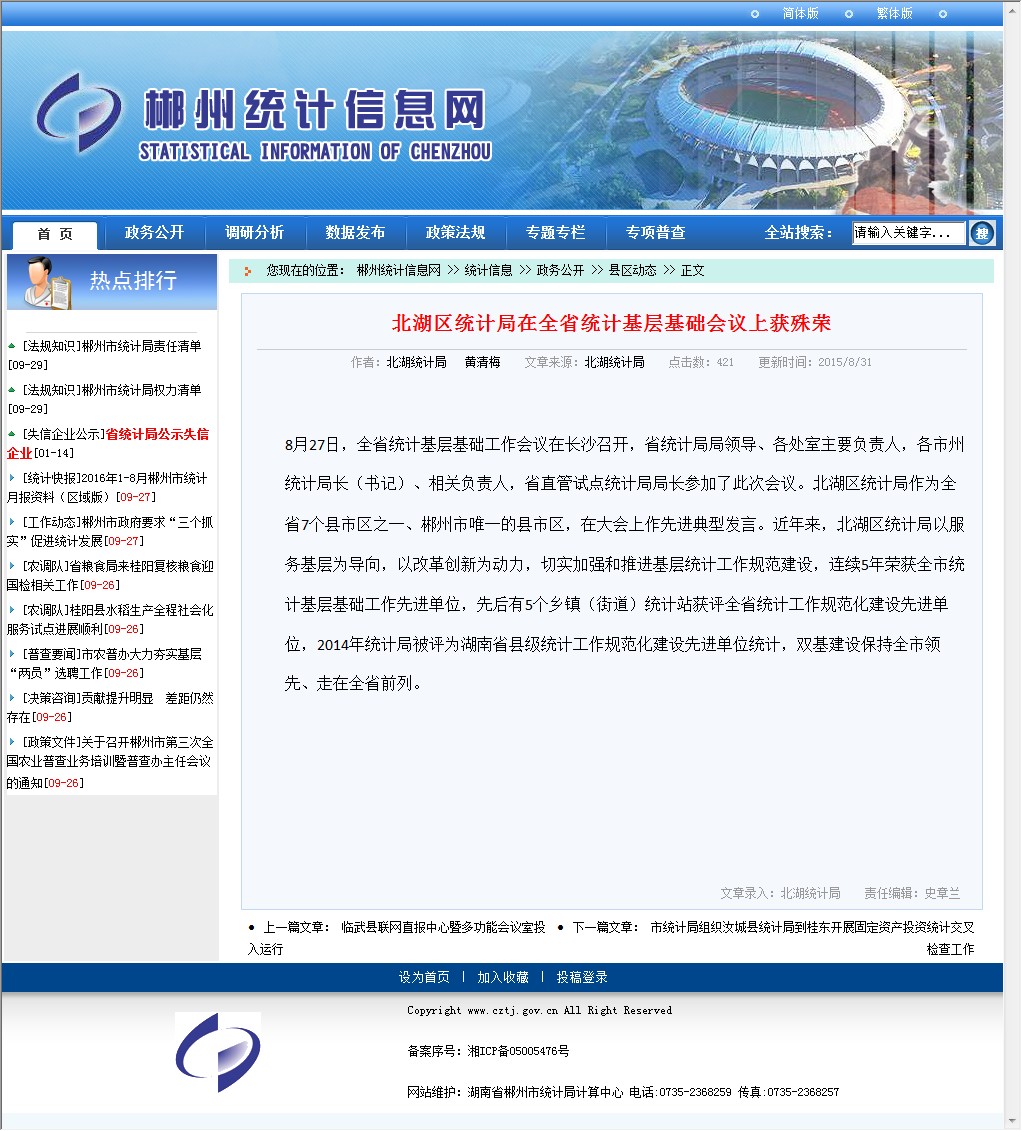 8月27日,全省统计基层基础工作会议在长沙召开,省统计局局领导、各处室主要负责人,各市州统计局长(书记)、相关负责人,省直管试点统计局局长参加了此次会议。北湖区统计局作为全省7个县市区之一、郴州市唯一的县市区,在大会上作先进典型发言。近年来,北湖区统计局以服务基层为导向,以改革创新为动力,切实加强和推进基层统计工作规范建设,连续5年荣获全市统计基层基础工作先进单位,先后有5个乡镇(街道)统计站获评全省统计工作规范化建设先进单位,2014年统计局被评为湖南省县级统计工作规范化建设先进单位统计,双基建设保持全市领先、走在全省前列。