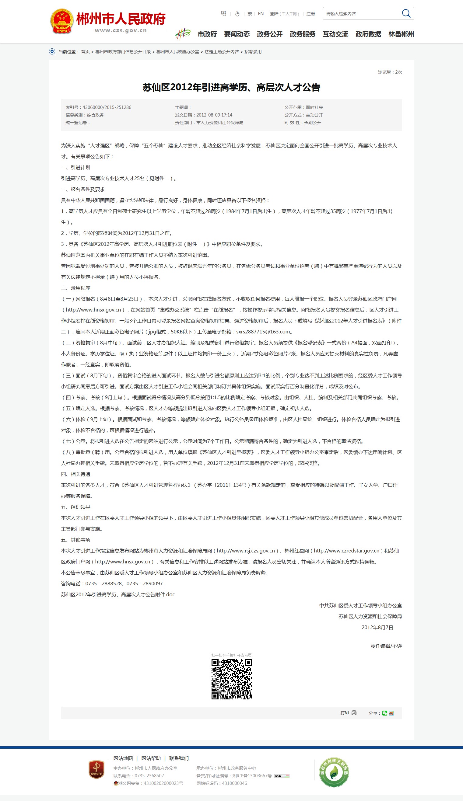 本次人才引进工作指定信息发布网站为郴州市人力资源和社会保障局网(http://www.rsj.czs.gov.cn)、郴州红星网(http://www.czredstar.gov.cn)和苏仙区政府门户网(http://www.hnsx.gov.cn),有关信息和工作安排以上述网站发布为准,请报名人员密切关注,并确认本人所留通讯方式保持通畅。