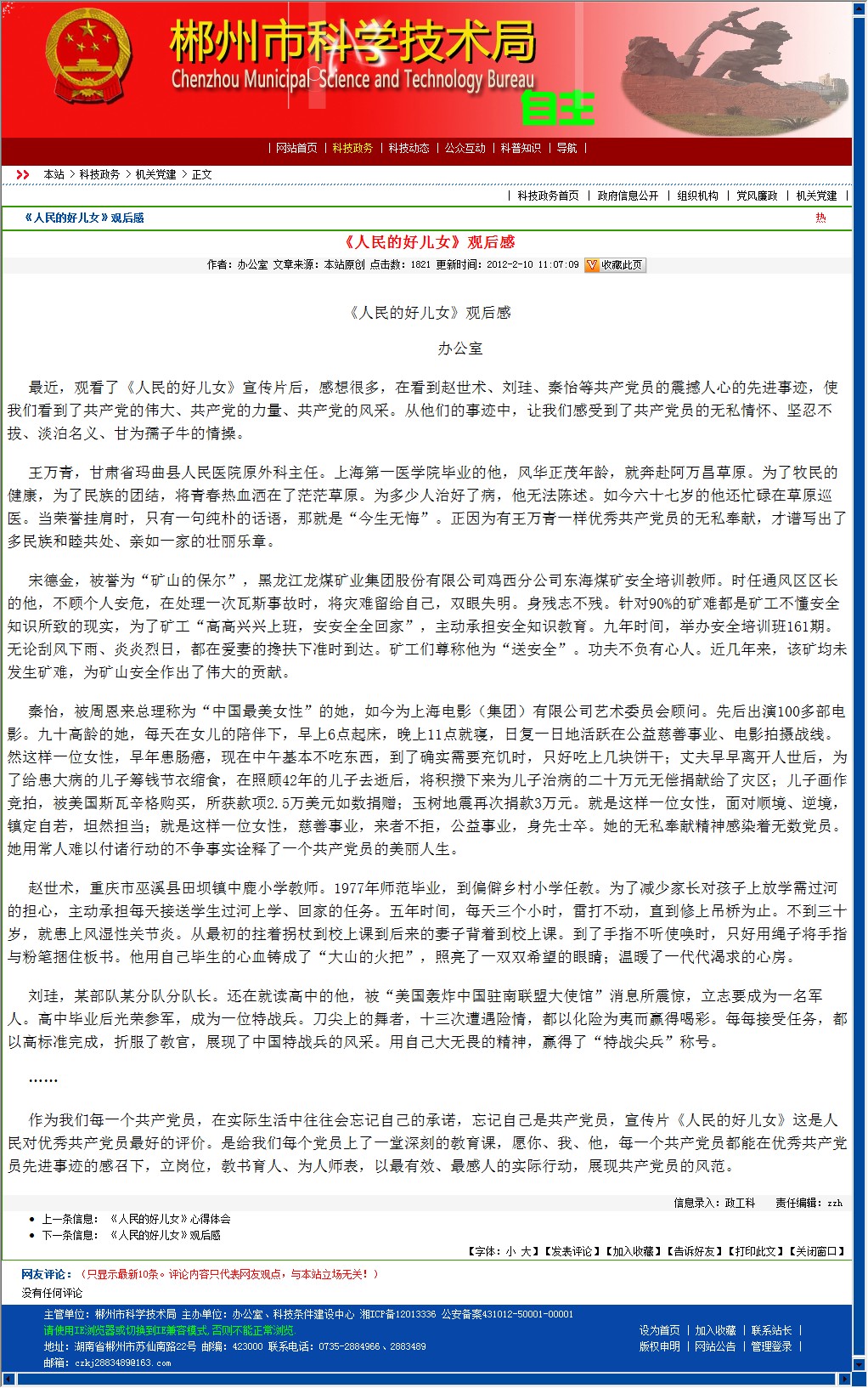 作为我们每一个共产党员,在实际生活中往往会忘记自己的承诺,忘记自己是共产党员,宣传片《人民的好儿女》这是人民对优秀共产党员最好的评价。是给我们每个党员上了一堂深刻的教育课,愿你、我、他,每一个共产党员都能在优秀共产党员先进事迹的感召下,立岗位,教书育人、为人师表,以最有效、最感人的实际行动,展现共产党员的风范。