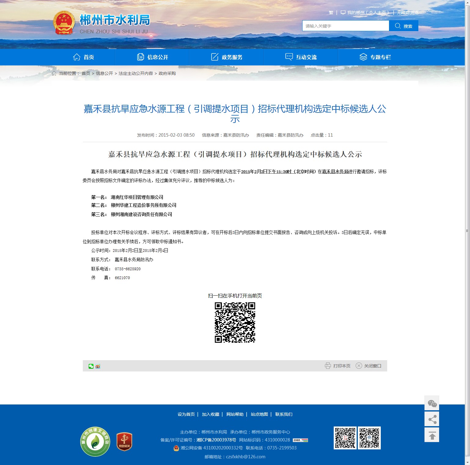 嘉禾县抗旱应急水源工程(引调提水项目)招标代理机构选定中标候选人公示