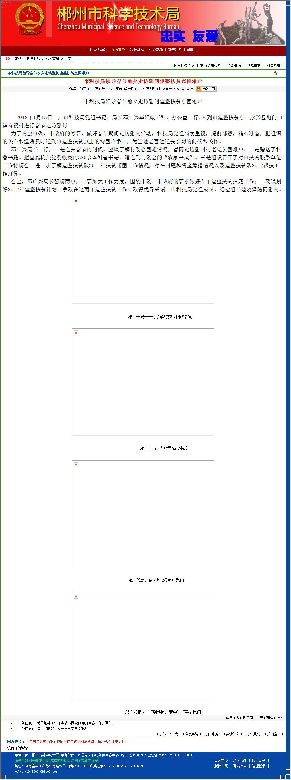 2012年1月15日 ,市科技局党组书记、局长邓广兴率领政工科、办公室一行7人到市建整扶贫点—永兴县塘门口镇寿祝村进行春节走访慰问。