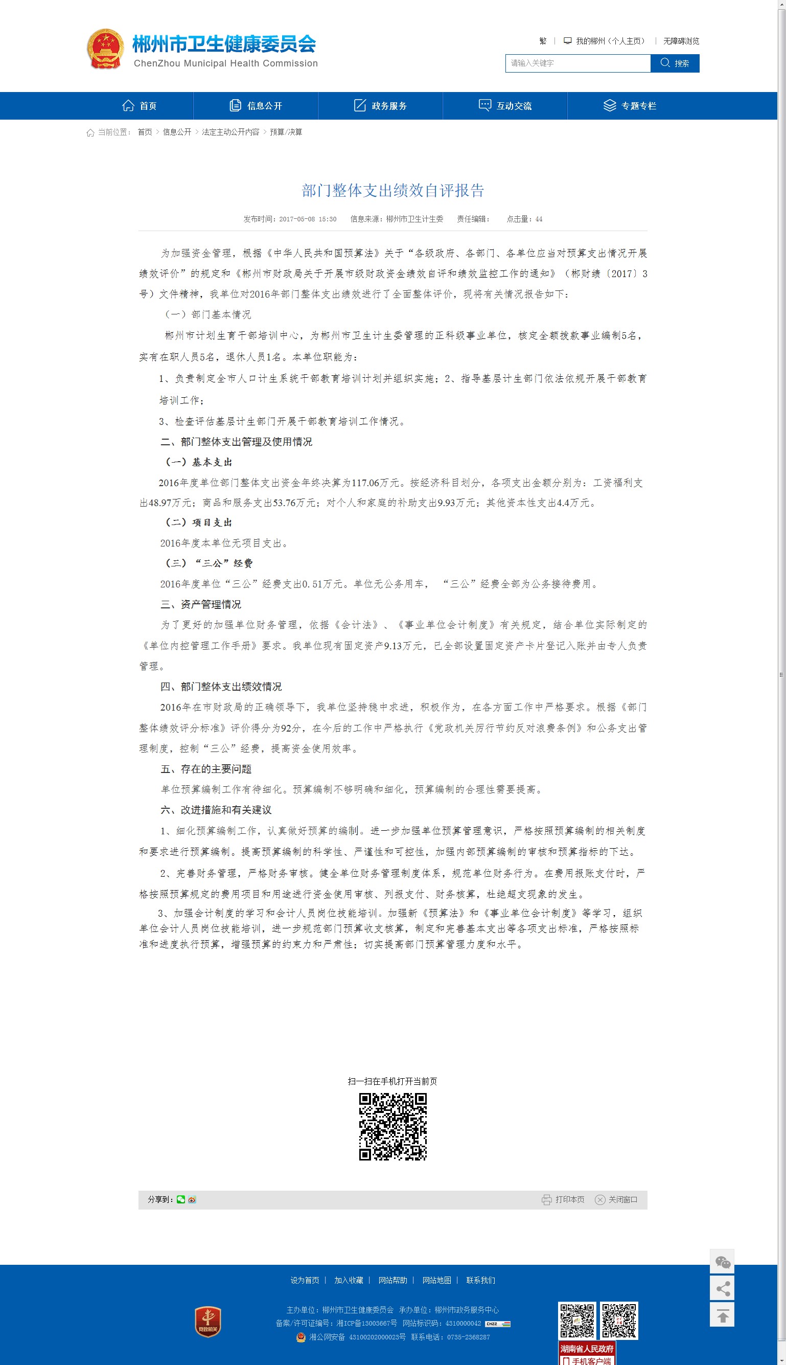 为加强资金管理,根据《中华人民共和国预算法》关于“各级政府、各部门、各单位应当对预算支出情况开展绩效评价”的规定和《郴州市财政局关于开展市级财政资金绩效自评和绩效监控工作的通知》(郴财绩〔2017〕3号)文件精神,我单位对2016年部门整体支出绩效进行了全面整体评价,现将有关情况报告如下: