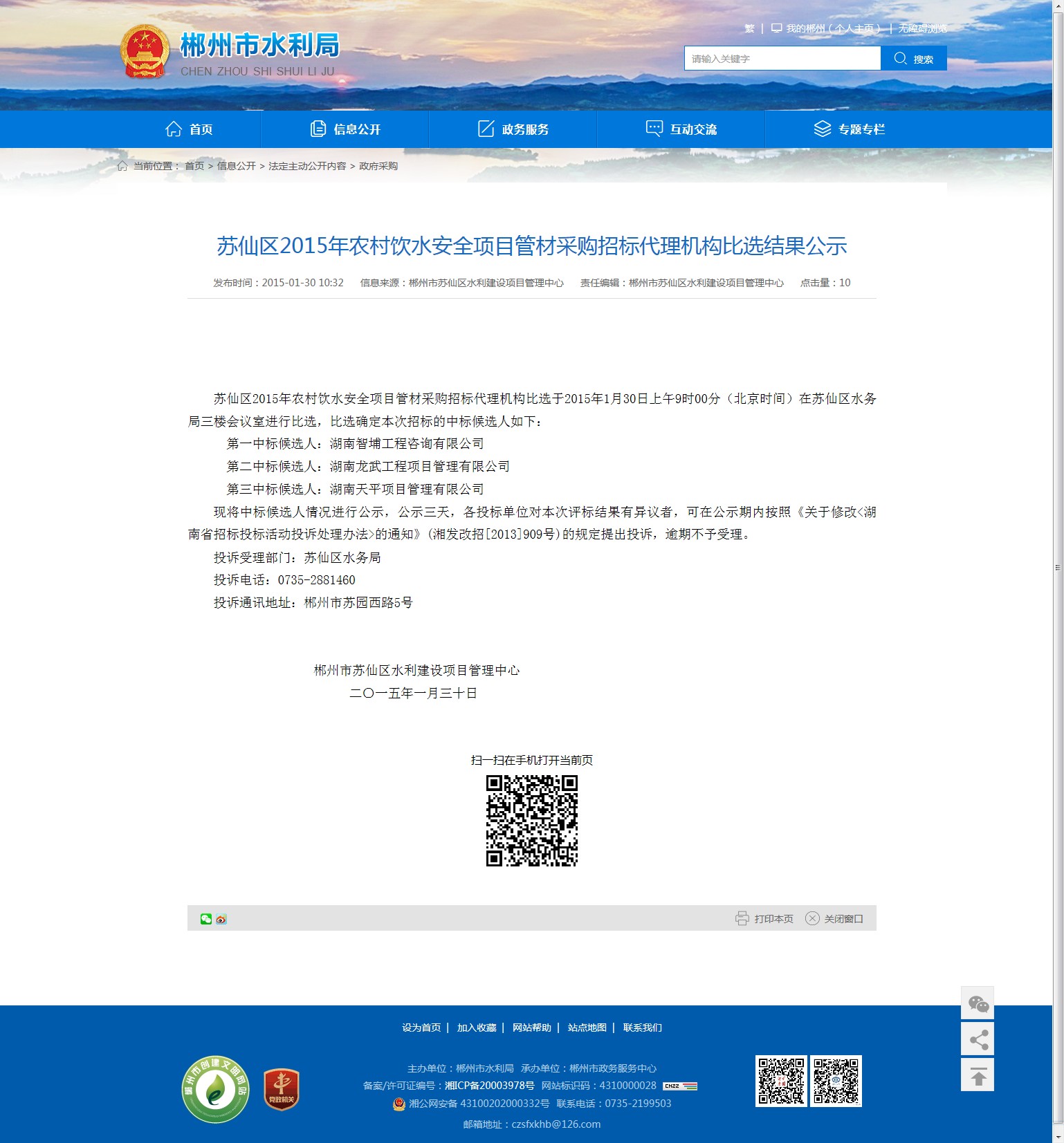 苏仙区2015年农村饮水安全项目管材采购招标代理机构比选于2015年1月30日上午9时00分(北京时间)在苏仙区水务局三楼会议室进行比选,比选确定本次招标的中标候选人如下:
