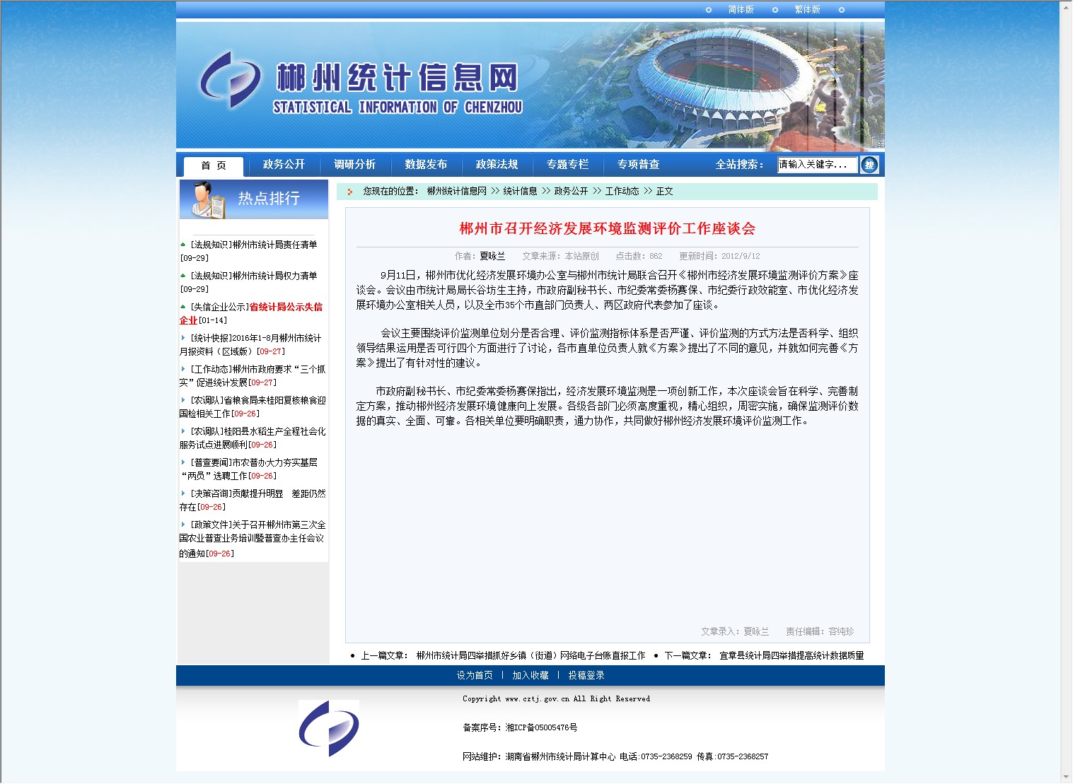 9月11日,郴州市优化经济发展环境办公室与郴州市统计局联合召开《郴州市经济发展环境监测评价方案》座谈会。会议由市统计局局长谷坊生主持,市政府副秘书长、市纪委常委杨赛保、市纪委行政效能室、市优化经济发展环境办公室相关人员,以及全市35个市直部门负责人、两区政府代表参加了座谈。