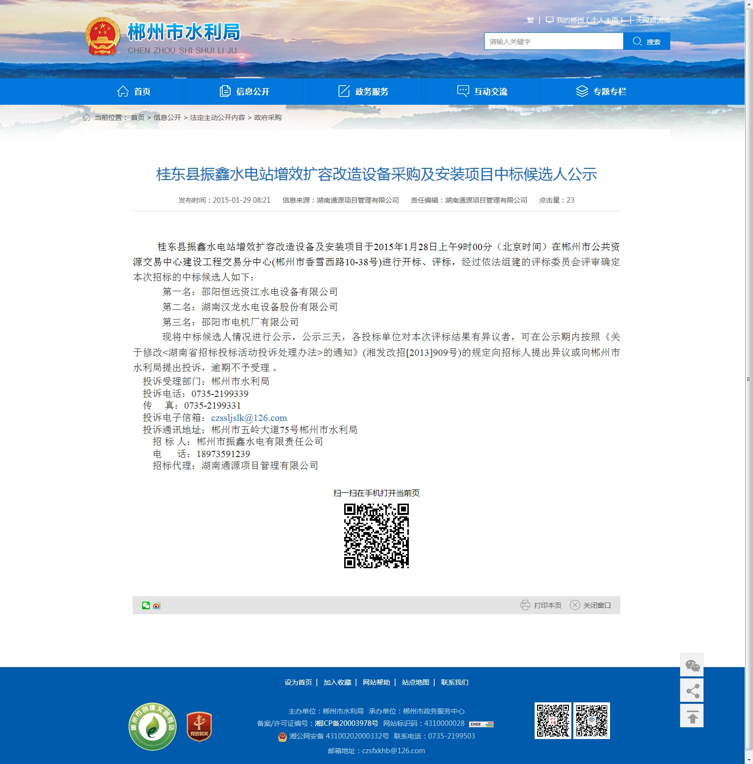 投诉受理部门:郴州市水利局
