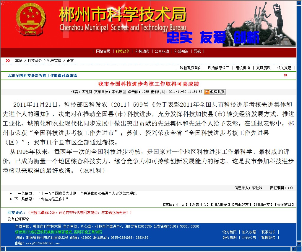 2011年11月21日,科技部国科发农〔2011〕599号《关于表彰2011年全国县市科技进步考核先进集体和先进个人的通知》,决定对在推动全国县(市)科技进步,充分发挥科技加快县(市)转变经济发展方式、推进工业化、城镇化和农业现代化同步发展中做出突出贡献的先进集体和先进个人给予表彰。在通报表彰中,郴州市荣获“全国科技进步考核工作先进市”;苏仙、资兴荣获全省“全国科技进步考核工作先进县(区)”;我市11个县市区全部通过考核。