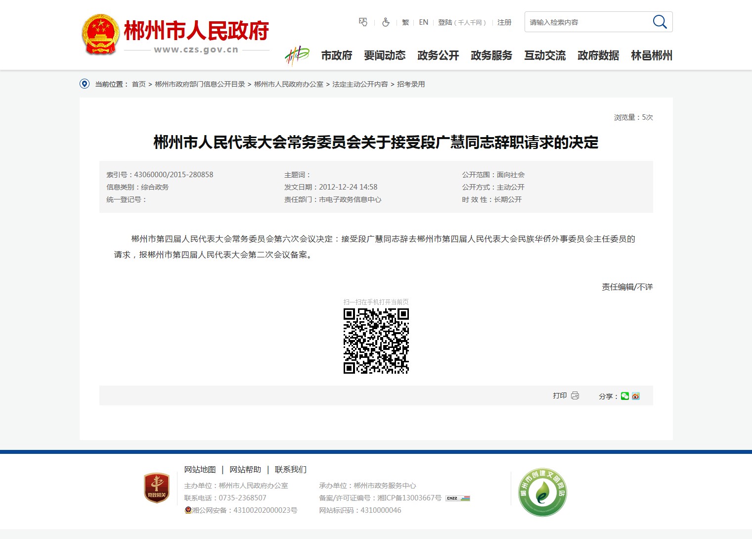 郴州市第四届人民代表大会常务委员会第六次会议决定:接受段广慧同志辞去郴州市第四届人民代表大会民族华侨外事委员会主任委员的请求,报郴州市第四届人民代表大会第二次会议备案。