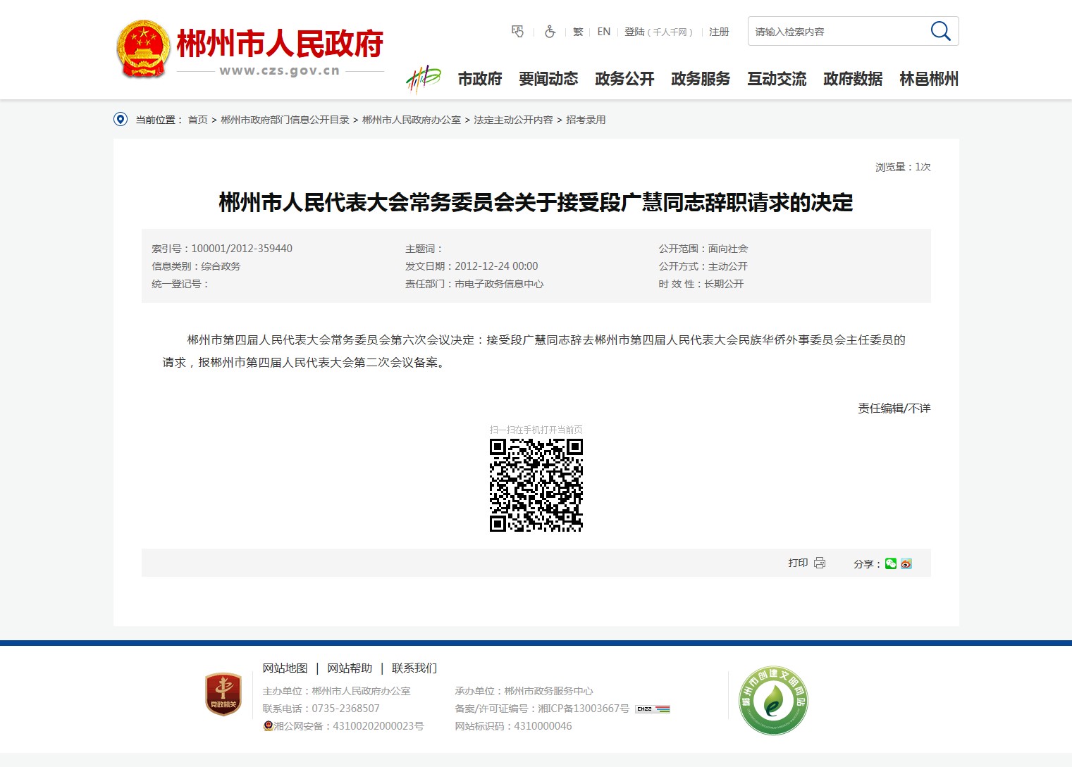 郴州市第四届人民代表大会常务委员会第六次会议决定:接受段广慧同志辞去郴州市第四届人民代表大会民族华侨外事委员会主任委员的请求,报郴州市第四届人民代表大会第二次会议备案。