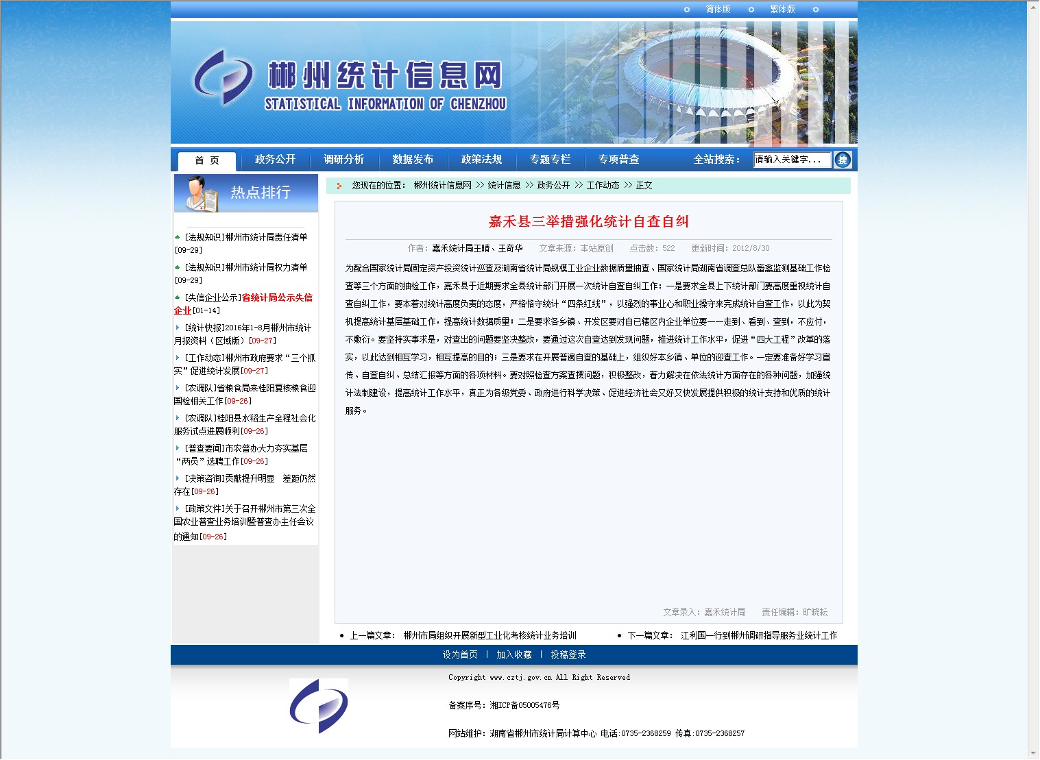 为配合国家统计局固定资产投资统计巡查及湖南省统计局规模工业企业数据质量抽查、国家统计局湖南省调查总队畜禽监测基础工作检查等三个方面的抽检工作,嘉禾县于近期要求全县统计部门开展一次统计自查自纠工作:一是要求全县上下统计部门要高度重视统计自查自纠工作,要本着对统计高度负责的态度,严格恪守统计“四条红线”,以强烈的事业心和职业操守来完成统计自查工作,以此为契机提高统计基层基础工作,提高统计数据质量;二是要求各乡镇、开发区要对自已辖区内企业单位要一一走到、看到、查到,不应付,不敷衍。要坚持实事求是,对查出的问题要坚决整改,要通过这次自查达到发现问题,推进统计工作水平,促进“四大工程”改革的落实,以此达到相互学习,相互提高的目的;三是要求在开展普遍自查的基础上,组织好本乡镇、单位的迎查工作。一定要准备好学习宣传、自查自纠、总结汇报等方面的各项材料。要对照检查方案查摆问题,积极整改,着力解决在依法统计方面存在的各种问题,加强统计法制建设,提高统计工作水平,真正为各级党委、政府进行科学决策、促进经济社会又好又快发展提供积极的统计支持和优质的统计服务。