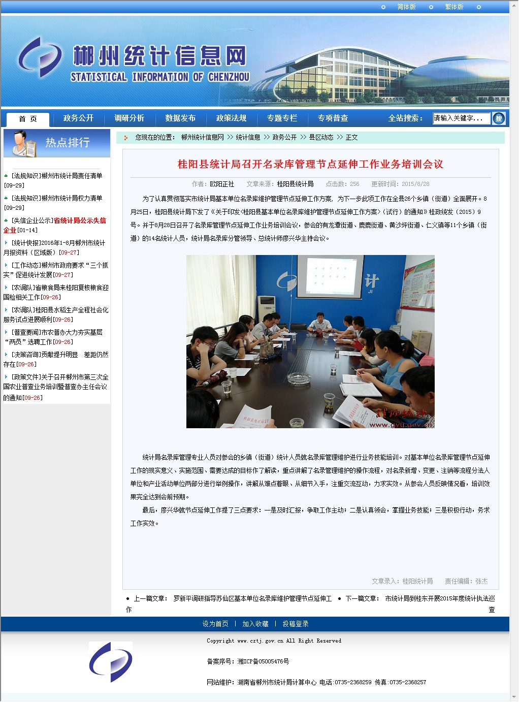 为了认真贯彻落实市统计局基本单位名录库维护管理节点延伸工作方案, 为下一步此项工作在全县26个乡镇(街道)全面展开。8月25日,桂阳县统计局下发了《关于印发<桂阳县基本单位名录库维护管理节点延伸工作方案>(试行)的通知》桂政统发〔2015〕9号。并于8月28日召开了名录库管理节点延伸工作业务培训会议,参会的有龙潭街道、鹿鹿街道、黄沙坪街道、仁义镇等11个乡镇(街道)的14名统计人员,统计局名录库分管领导、总统计师廖兴华主持会议。