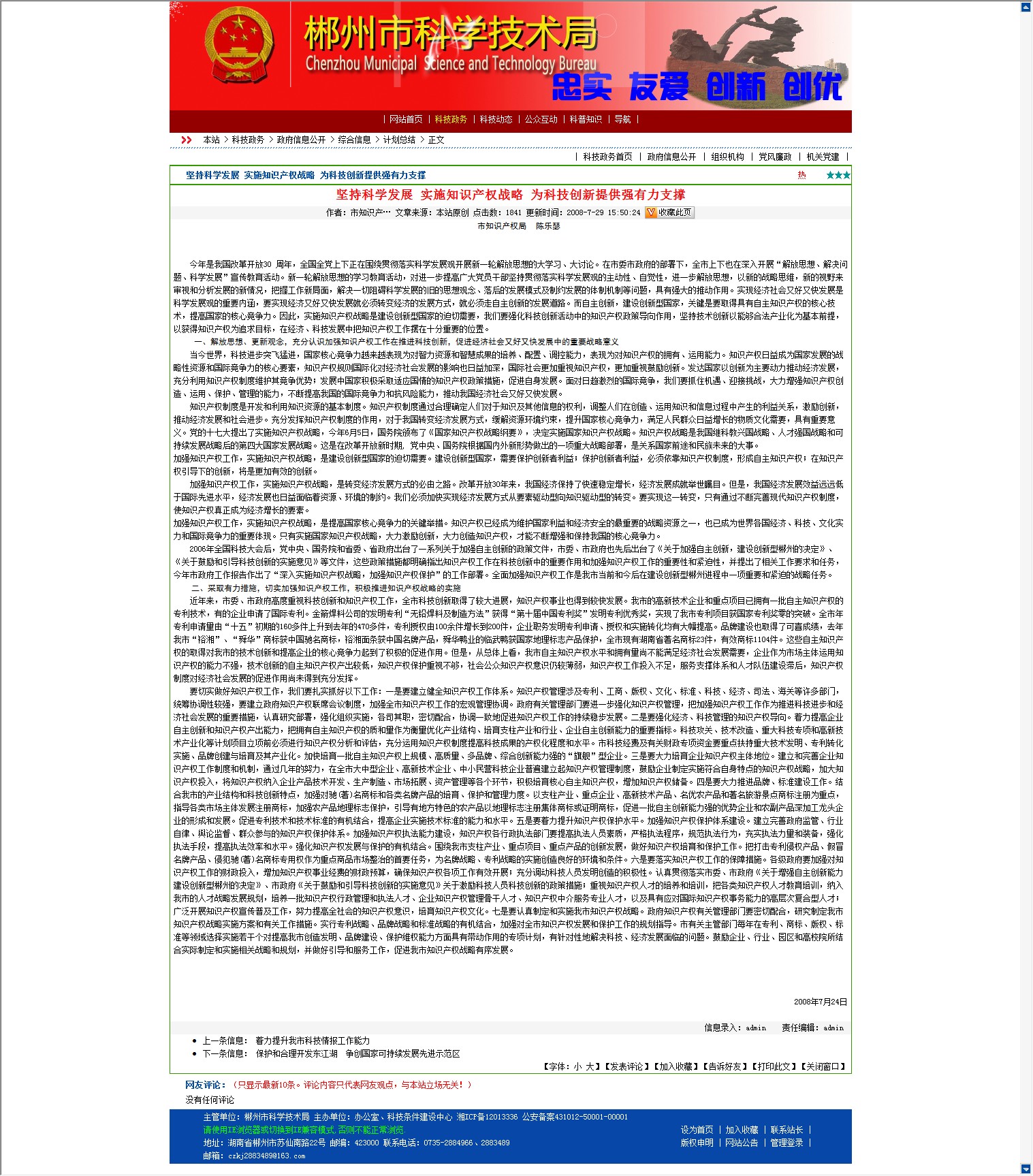 2006年全国科技大会后,党中央、国务院和省委、省政府出台了一系列关于加强自主创新的政策文件,市委、市政府也先后出台了《关于加强自主创新,建设创新型郴州的决定》、《关于鼓励和引导科技创新的实施意见》等文件,这些政策措施都明确指出知识产权工作在科技创新中的重要作用和加强知识产权工作的重要性和紧迫性,并提出了相关工作要求和任务,今年市政府工作报告作出了“深入实施知识产权战略,加强知识产权保护”的工作部署。全面加强知识产权工作是我市当前和今后在建设创新型郴州进程中一项重要和紧迫的战略任务。
