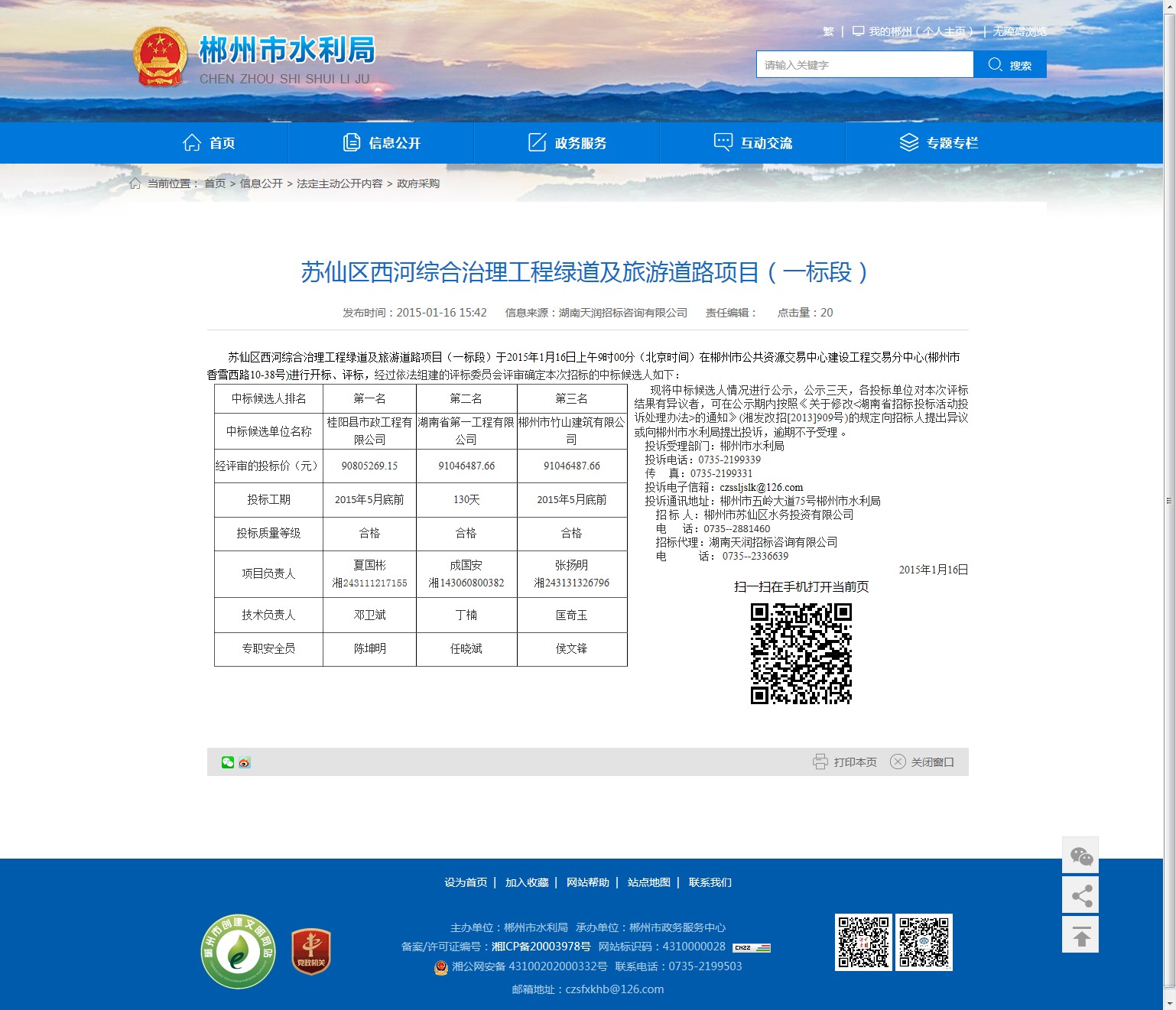 现将中标候选人情况进行公示,公示三天,各投标单位对本次评标结果有异议者,可在公示期内按照《关于修改<湖南省招标投标活动投诉处理办法>的通知》(湘发改招[2013]909号)的规定向招标人提出异议或向郴州市水利局提出投诉,逾期不予受理 。