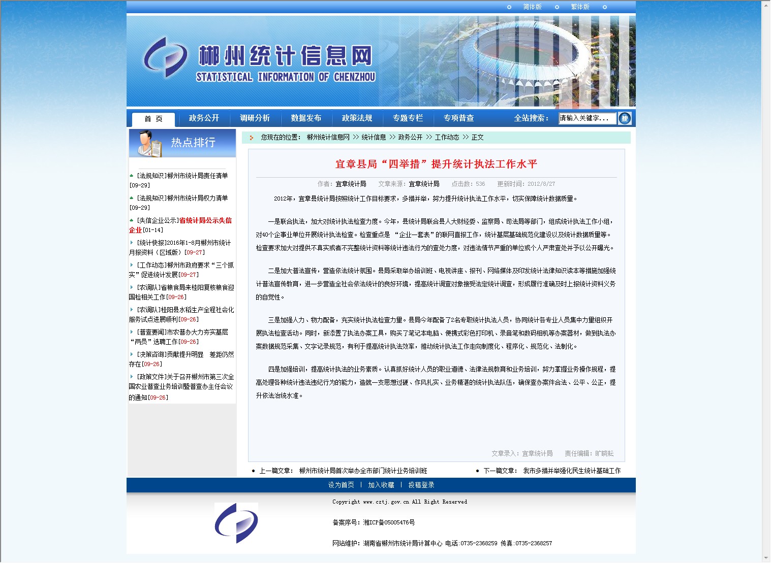 2012年,宜章县统计局按照统计工作目标要求,多措并举,努力提升统计执法工作水平,切实保障统计数据质量。