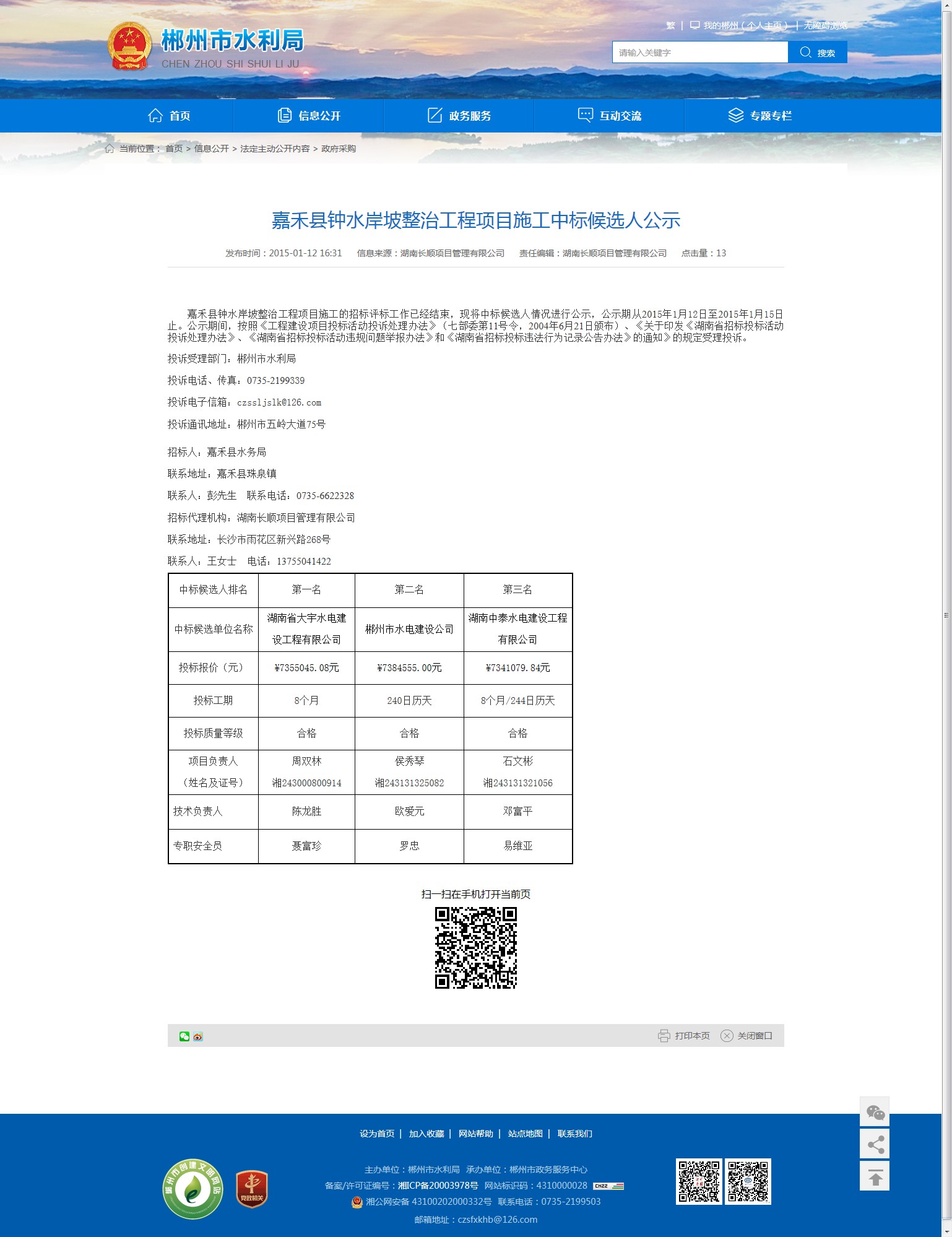 嘉禾县钟水岸坡整治工程项目施工的招标评标工作已经结束,现将中标候选人情况进行公示,公示期从2015年1月12日至2015年1月15日止。公示期间,按照《工程建设项目投标活动投诉处理办法》(七部委第11号令,2004年6月21日颁布)、《关于印发《湖南省招标投标活动投诉处理办法》、《湖南省招标投标活动违规问题举报办法》和《湖南省招标投标违法行为记录公告办法》的通知》的规定受理投诉。