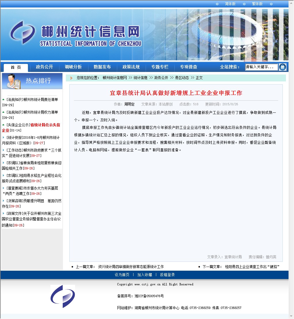 近期,宜章县统计局为及时反映新建工业企业投产达效情况,对全县新建新投产工业企业进行了摸底,争取做到成熟一个,申报一个,及时入统。