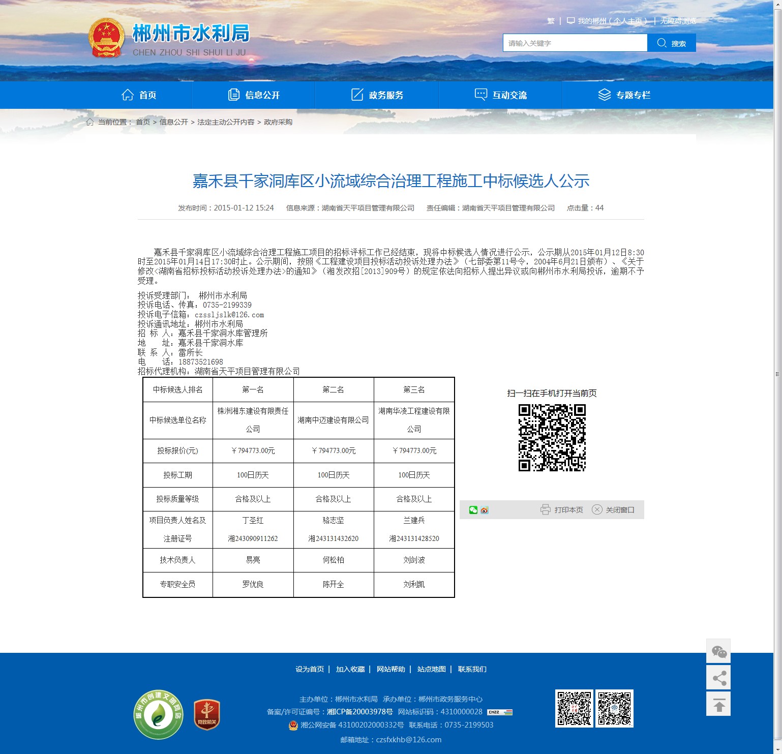 投诉通讯地址:郴州市水利局