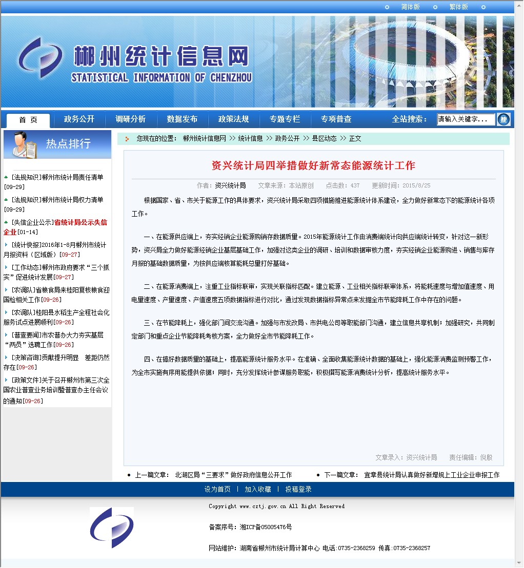 根据国家、省、市关于能源工作的具体要求,资兴统计局采取四项措施推进能源统计体系建设,全力做好新常态下的能源统计各项工作。