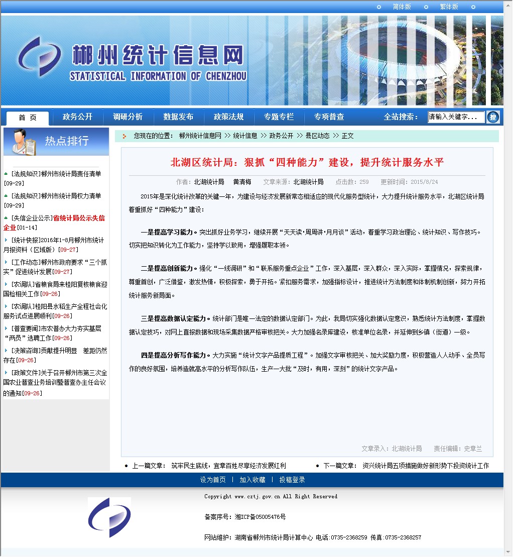 2015年是深化统计改革的关键一年,为建设与经济发展新常态相适应的现代化服务型统计,大力提升统计服务水平,北湖区统计局着重抓好“四种能力”建设: