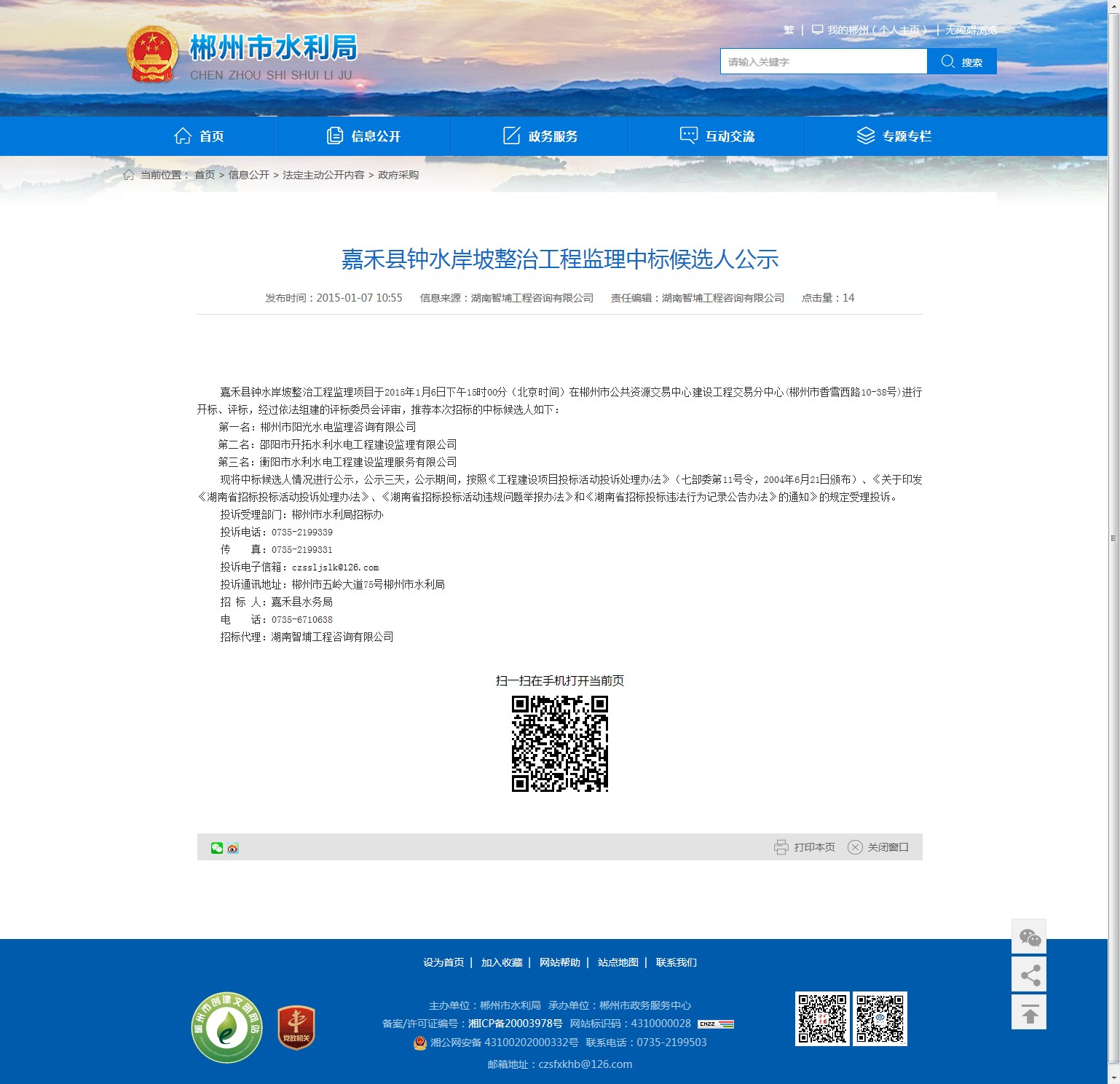 投诉受理部门:郴州市水利局招标办