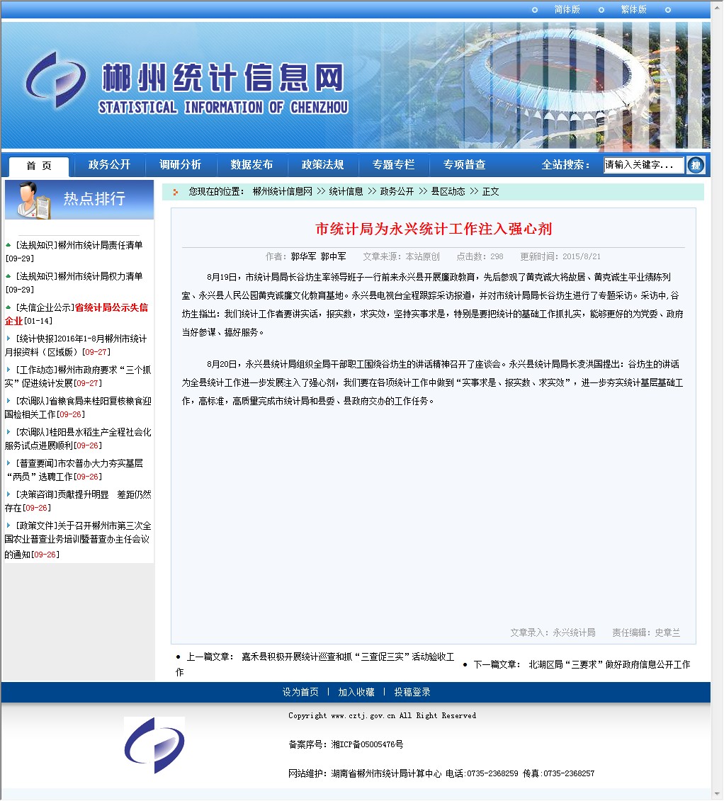 8月19日,市统计局局长谷坊生率领导班子一行前来永兴县开展廉政教育,先后参观了黄克诚大将故居、黄克诚生平业绩陈列室、永兴县人民公园黄克诚廉文化教育基地。永兴县电视台全程跟踪采访报道,并对市统计局局长谷坊生进行了专题采访。采访中,谷坊生指出:我们统计工作者要讲实话,报实数,求实效,坚持实事求是,特别是要把统计的基础工作抓扎实,能够更好的为党委、政府当好参谋、搞好服务。