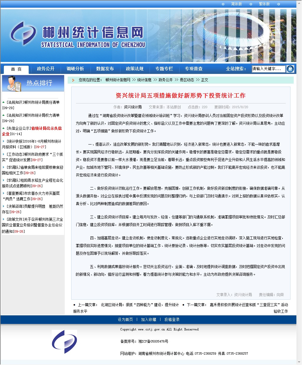 五、利用数据成果搞好统计服务。密切关注投资运行,全面、准确、及时地提供统计调查数据,及时把握固定资产投资中出现的新情况、新动向,搞好运行监测和预警,着力提高统计参与决策的能力和水平,主动为市政府提供决策咨询服务。