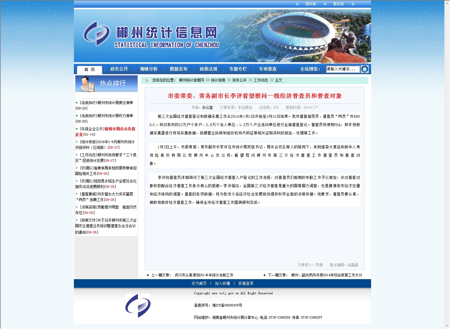 1月3日上午,市委常委、常务副市长李评在市统计局党组书记、局长谷坊生等人的陪同下,来到雄森大酒店和新华人寿保险股份有限公司郴州中心支公司,看望慰问郴州市第三次经济普查工作普查员和普查对象。