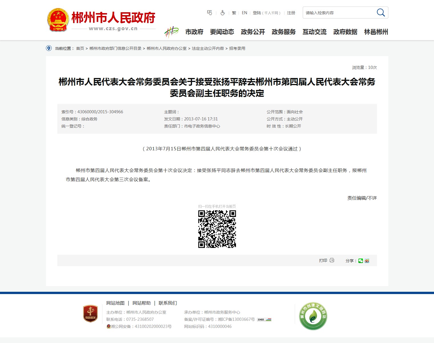 郴州市第四届人民代表大会常务委员会第十次会议决定:接受张扬平同志辞去郴州市第四届人民代表大会常务委员会副主任职务,报郴州市第四届人民代表大会第三次会议备案。