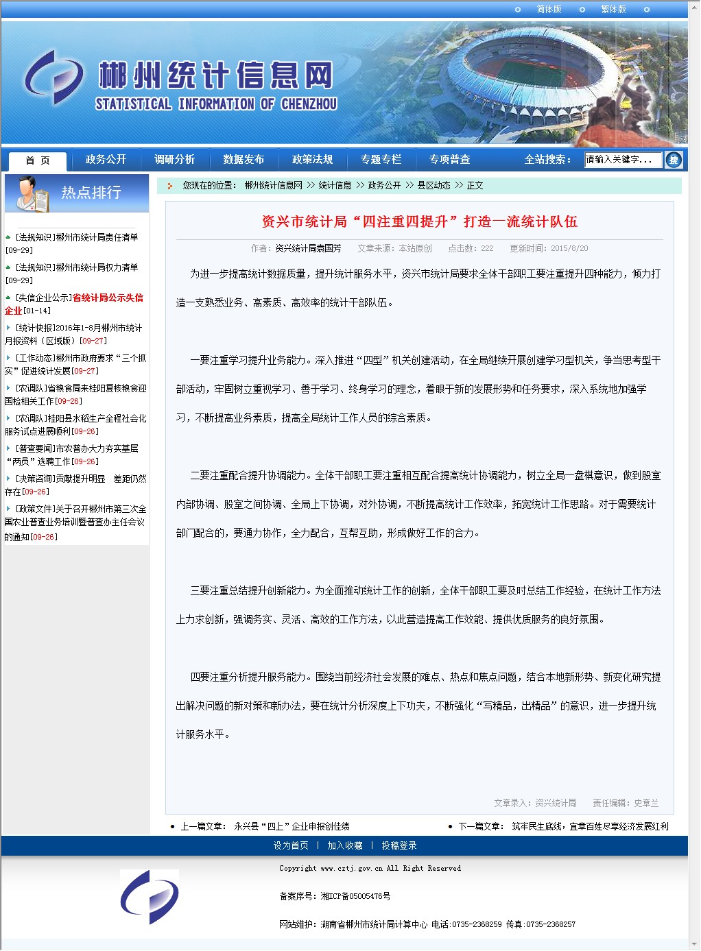 为进一步提高统计数据质量,提升统计服务水平,资兴市统计局要求全体干部职工要注重提升四种能力,倾力打造一支熟悉业务、高素质、高效率的统计干部队伍。