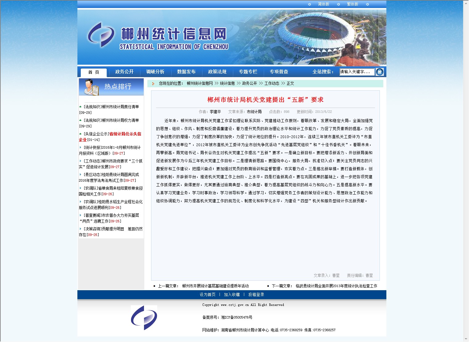 近年来,郴州市统计局机关党建工作紧扣理论联系实际、党建推动工作原则,着眼改革、发展和稳定大局,全面加强党的思想、组织、作风、制度和反腐倡廉建设,着力提升党员的政治理论水平和统计工作能力,力促了党员素质的提高,力促了争创意识的增强,力促了制度改革的加快,力促了统计地位的提升。2010-2012年,连续三年被市直机关工委评为“市直机关党建先进单位”,2012年被市直机关工委评为全市创先争优活动“先进基层党组织”和“十佳书香机关”。着眼未来,再攀新高。局党组书记、局长谷坊生对机关党建工作提出“五新”要求。一是确立新目标。要把增添新活力、开创新局面和促进新发展作为今后三年机关党建工作目标。二是理清新思路。要围绕中心,服务大局,找准切入点;要关注党员同志的兴趣爱好和工作建议,把握兴奋点;要加强对党员的教育培训和监督管理,夯实着力点。三是推出新举措。要打造新载体,创新新机制,开辟新平台,推进机关党建工作上台阶、上水平。四是打造新亮点。要在巩固成果的基础上,进一步把各项党建工作抓得更实,做得更好,尤其要通过培育典型、推介典型,着力提高基层党组织的战斗力和向心力。五是提高新水平。要认真学习党建业务,学习时事政治,学习领导科学。通过学习,切实增强党务工作者的策划设计能力、思想政治工作能力和组织协调能力,努力提高机关党建工作的规范化、制度化和科学化水平,为建设“四型”机关和服务型统计作出新贡献。