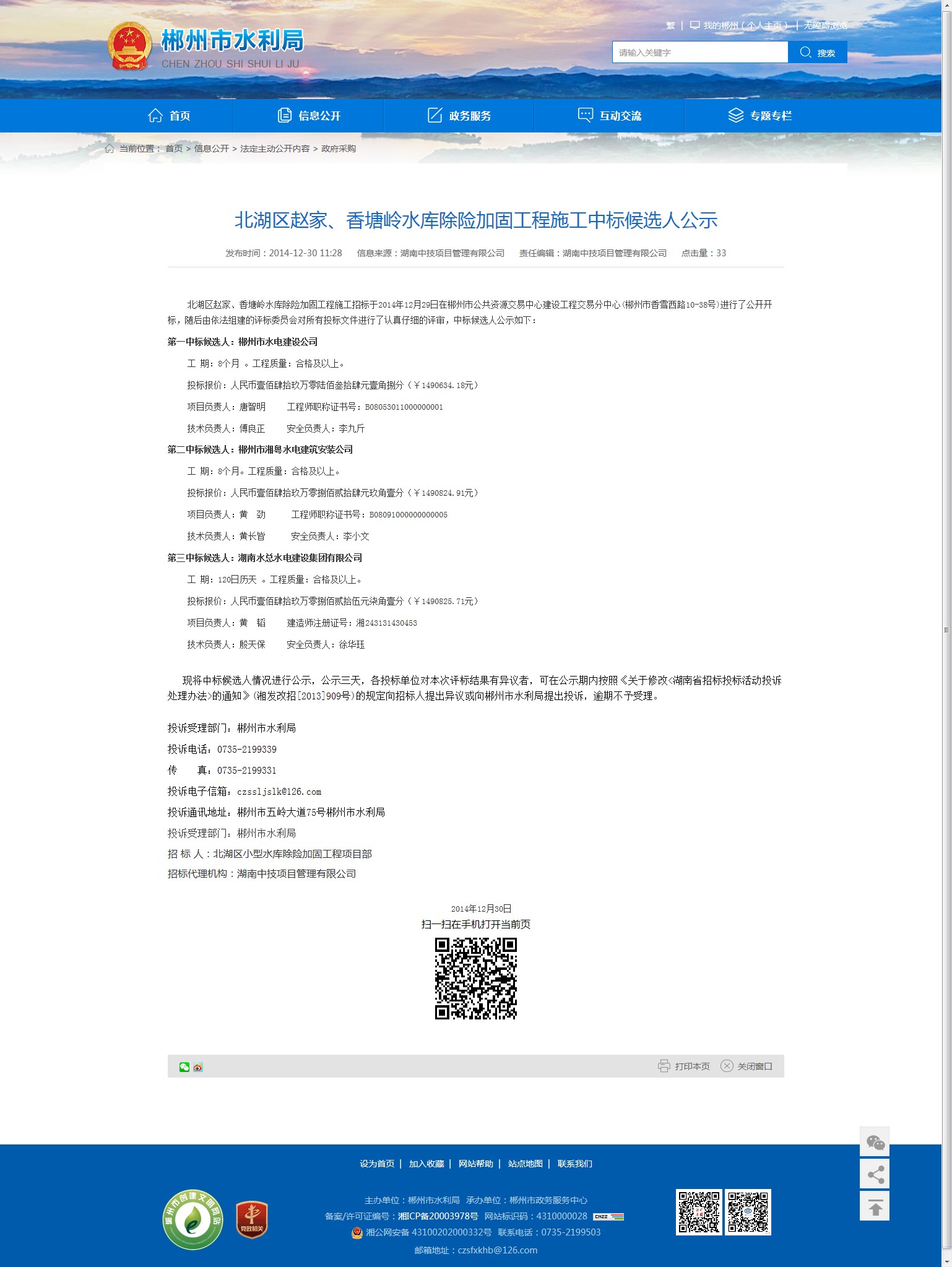 现将中标候选人情况进行公示,公示三天,各投标单位对本次评标结果有异议者,可在公示期内按照《关于修改<湖南省招标投标活动投诉处理办法>的通知》(湘发改招[2013]909号)的规定向招标人提出异议或向郴州市水利局提出投诉,逾期不予受理。
