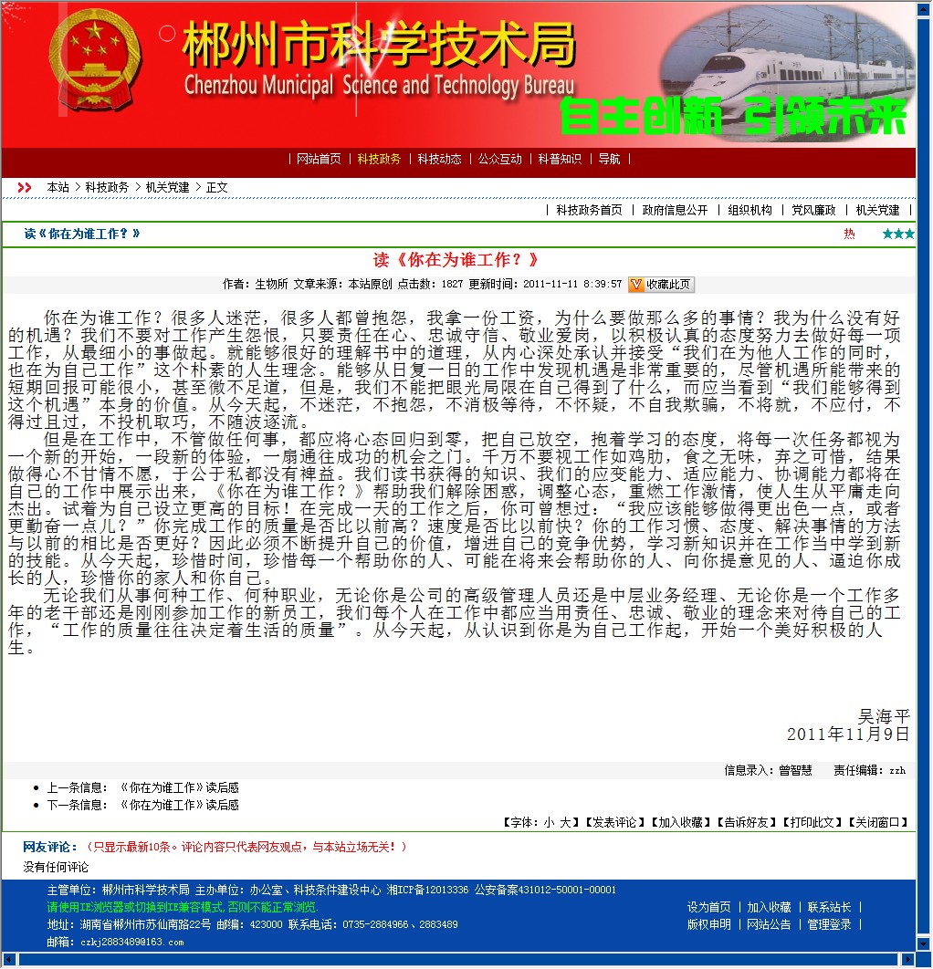 无论我们从事何种工作、何种职业,无论你是公司的高级管理人员还是中层业务经理、无论你是一个工作多年的老干部还是刚刚参加工作的新员工,我们每个人在工作中都应当用责任、忠诚、敬业的理念来对待自己的工作,“工作的质量往往决定着生活的质量”。从今天起,从认识到你是为自己工作起,开始一个美好积极的人生。