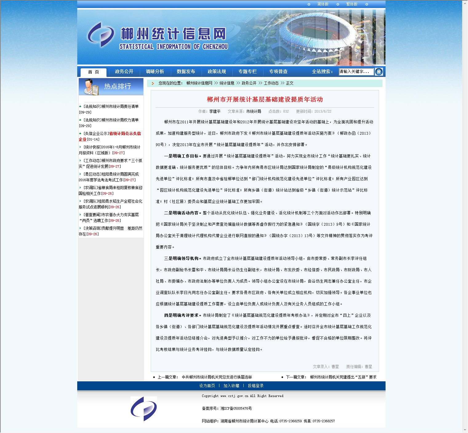 郴州市在2011年开展统计基层基础建设年和2012年开展统计基层基础建设攻坚年活动的基础上,为全面巩固和提升活动成果,加速构建服务型统计,近日,郴州市政府下发《郴州市统计基层基础建设提质年活动实施方案》(郴政办函〔2013〕90号),决定2013年在全市开展“统计基层基础建设提质年”活动,并作出安排部署。