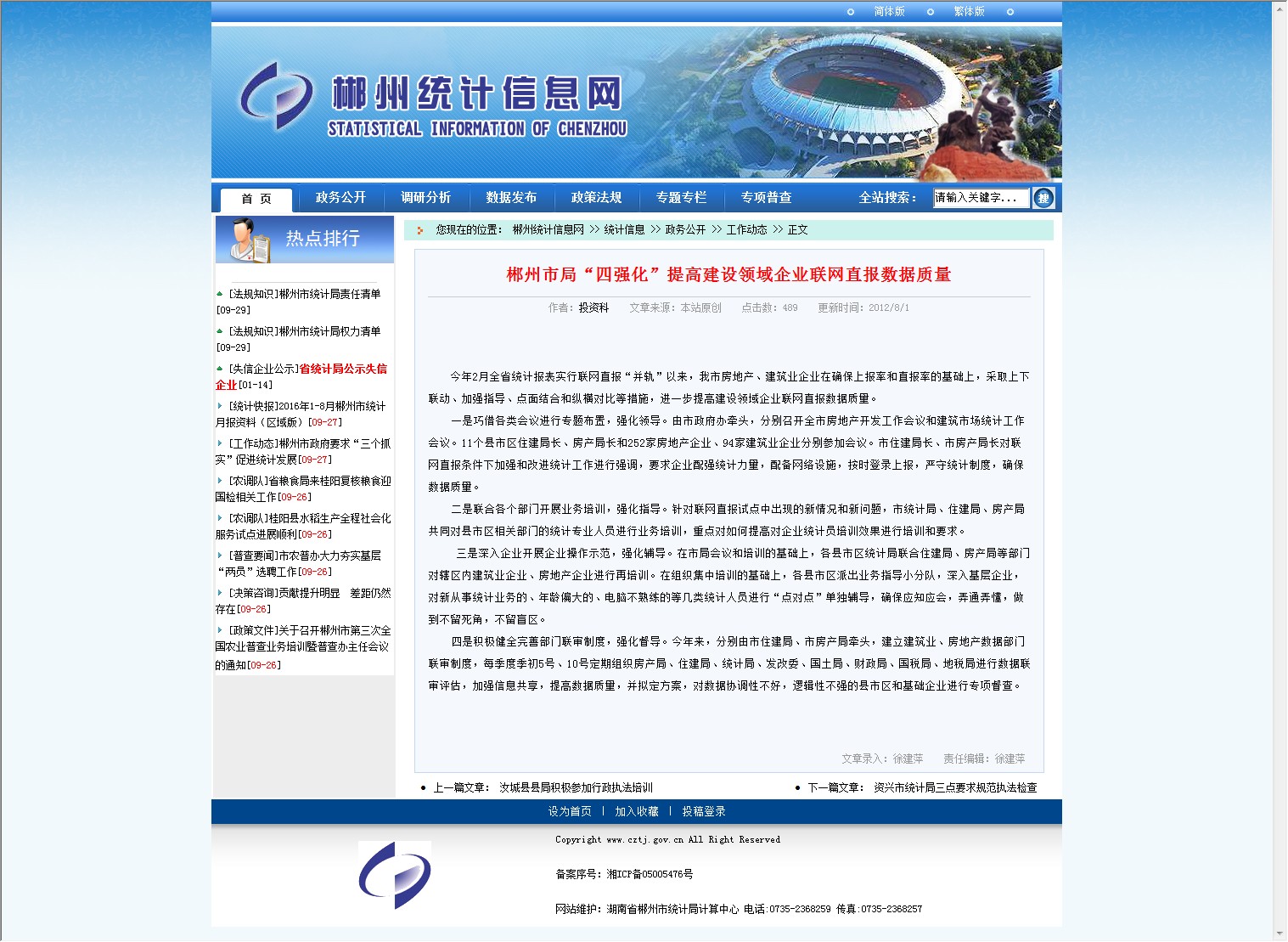 今年2月全省统计报表实行联网直报“并轨”以来,我市房地产、建筑业企业在确保上报率和直报率的基础上,采取上下联动、加强指导、点面结合和纵横对比等措施,进一步提高建设领域企业联网直报数据质量。