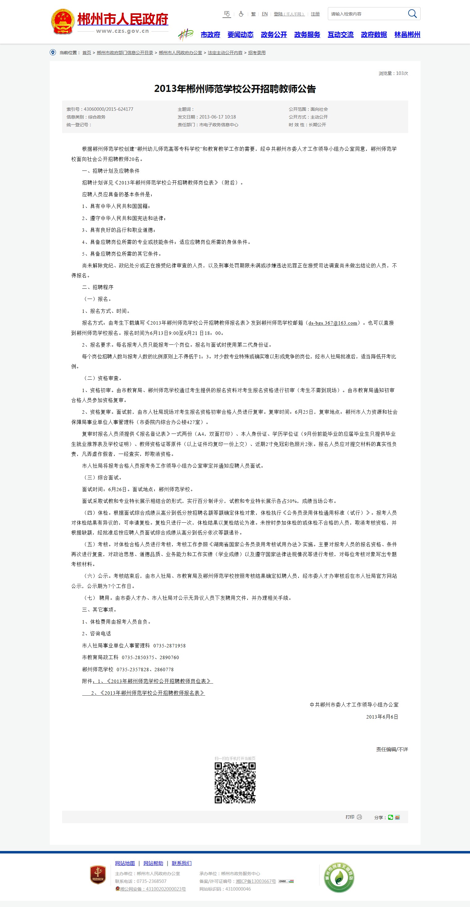 (六)公示。考核结束后,由市人社局、市教育局及郴州师范学校按照考核结果确定拟聘人员,经市委人才办审核后在市人社局官方网站公示,公示期为7个工作日。