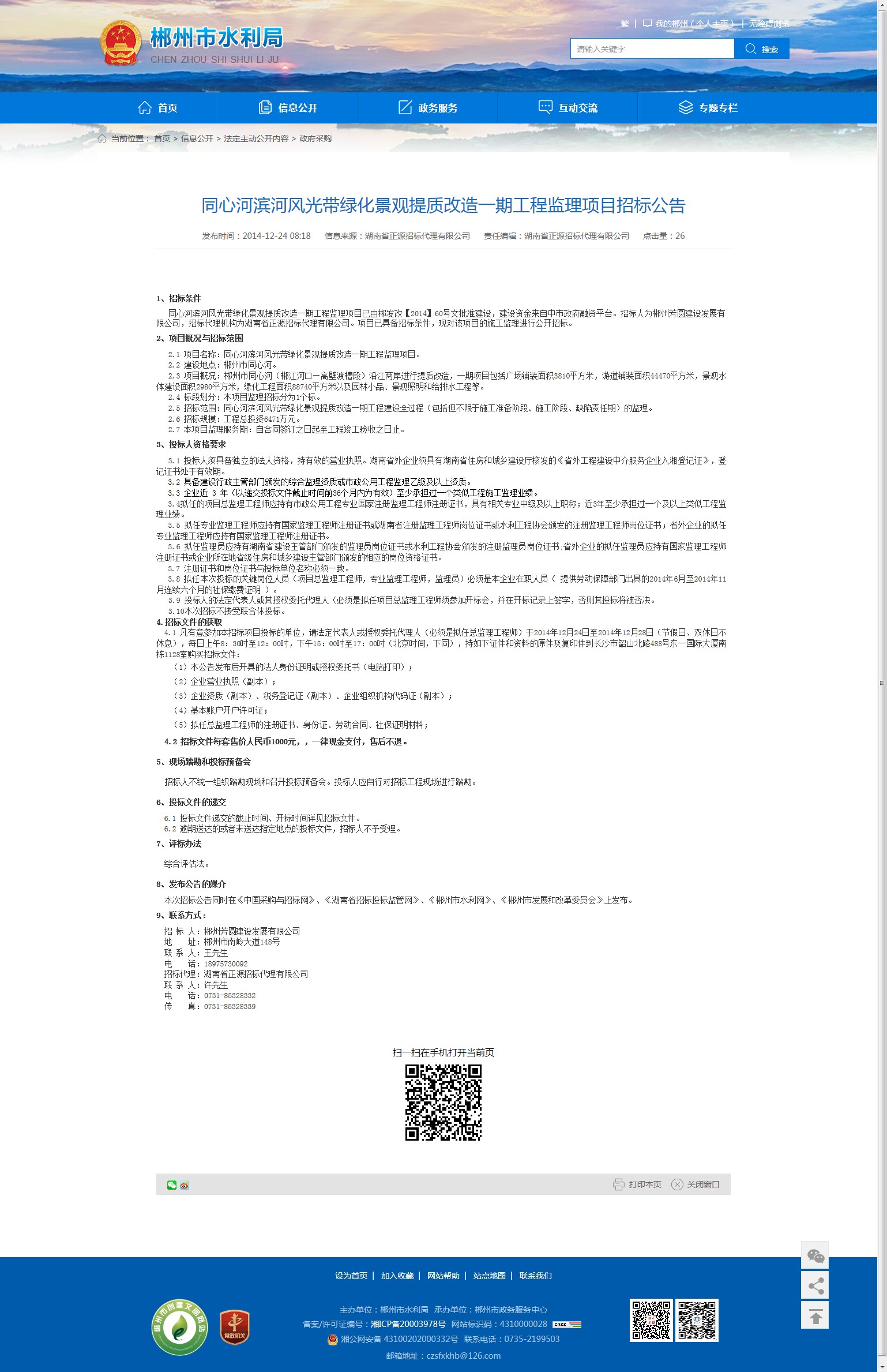 本次招标公告同时在《中国采购与招标网》、《湖南省招标投标监管网》、《郴州市水利网》、《郴州市发展和改革委员会》上发布。